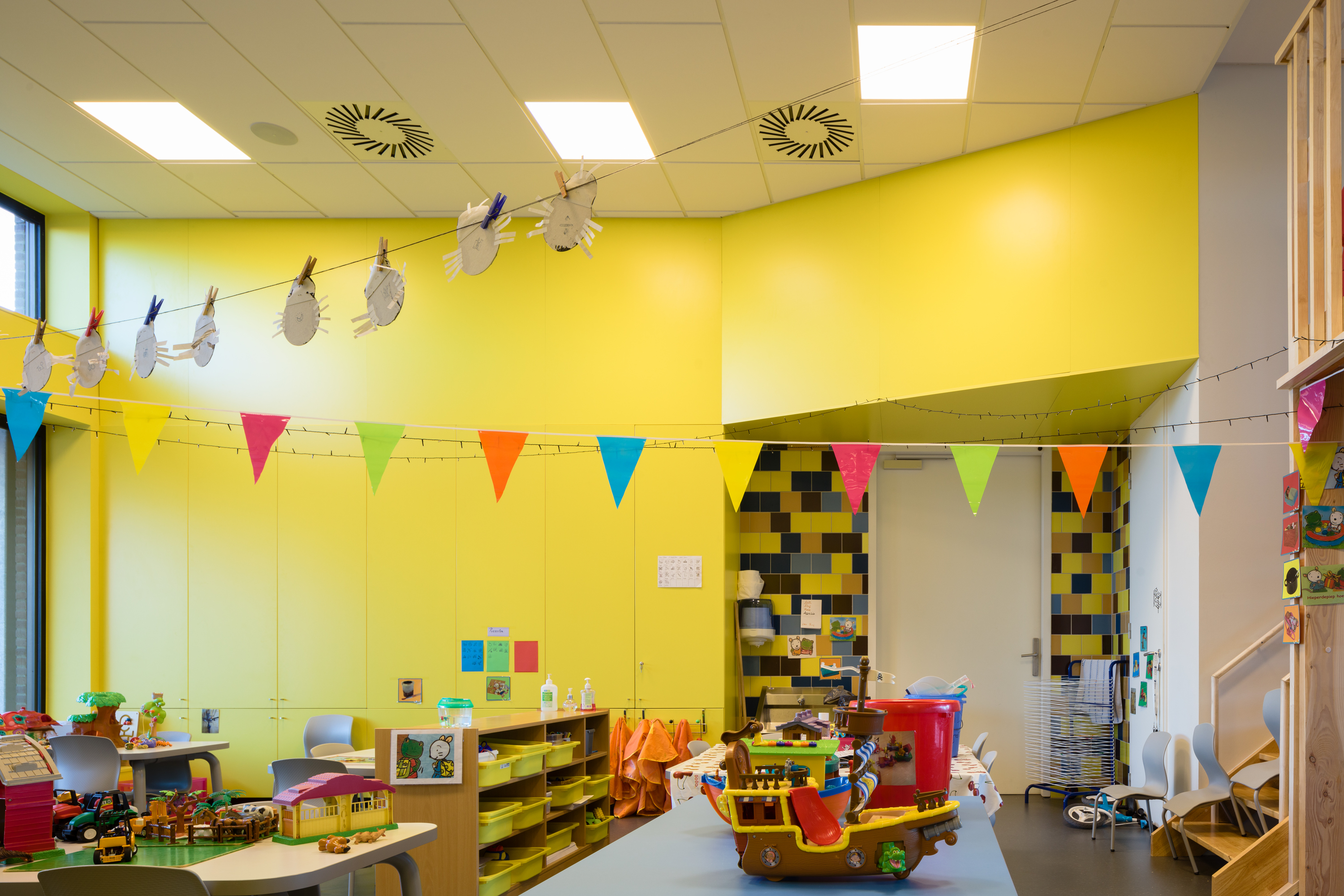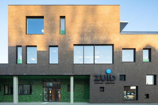 Depuis 2020, les 300 élèves, enseignants et membres du personnel de l'école primaire communale Zuid à Stasegem (Harelbeke) sont installés dans de tout nouveaux bâtiments. Le conseil communal a délibérément opté pour une école QNE (Quasi Neutre en Energie), mais souhaitait également, pour des raisons pédagogiques (co-enseignement et classes transversales), un bâtiment ouvert avec un grand espace polyvalent et de plus grandes classe.