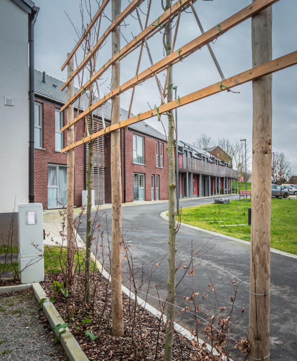 Par souci d’intégration au contexte bâti existant, les gabarits et volumétrie restent dans la droite ligne du logement traditionnel rural. Par contre, les façades ont été conçues de manière plus contemporaine. « La maîtrise d’un budget serré a mené à des choix sobres et raisonnés en matière d’esthétique », précise l’architecte. « Nous nous sommes donc limités à deux matériaux de parement, déclinés en deux tonalités uniquement : rouge foncé pour la brique et blanc cassé ou rouge pour l’enduit, en référence au cadre bâti dominant à Walhain. Grâce au choix de deux teintes de joints de parement, une sobre diversité est introduite dans les développés des façades des ensembles. De la même façon, la limitation volontaire à trois types de dimensions de baies, exprimant la fonction de l’espace correspondant, a permis une composition des façades reflétant le même esprit qui est porteuse d’unité pour le quartier. »