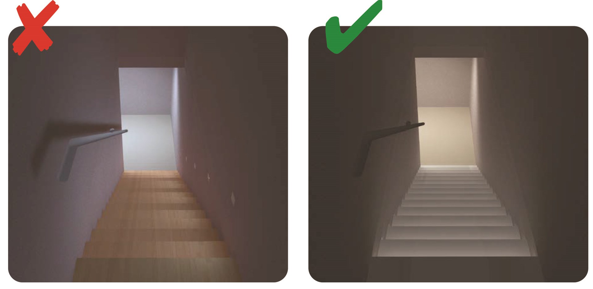 La première exigence concerne l’éclairement, exprimé en lux [lx]. Il s’agit de la quantité de lumière qui éclaire les marches. L’éclairement doit être suffisamment élevé pour que l’on puisse voir l’escalier dans son intégralité et distinguer les objets qui se trouvent éventuellement sur les marches. Le Guide pratique et technique de l’éclairage résidentiel recommande une valeur comprise entre 75 et 150 lx. Par ailleurs, un éclairage adéquat au pied de l’escalier permet d’améliorer la perception de la profondeur et la visibilité à cet endroit.