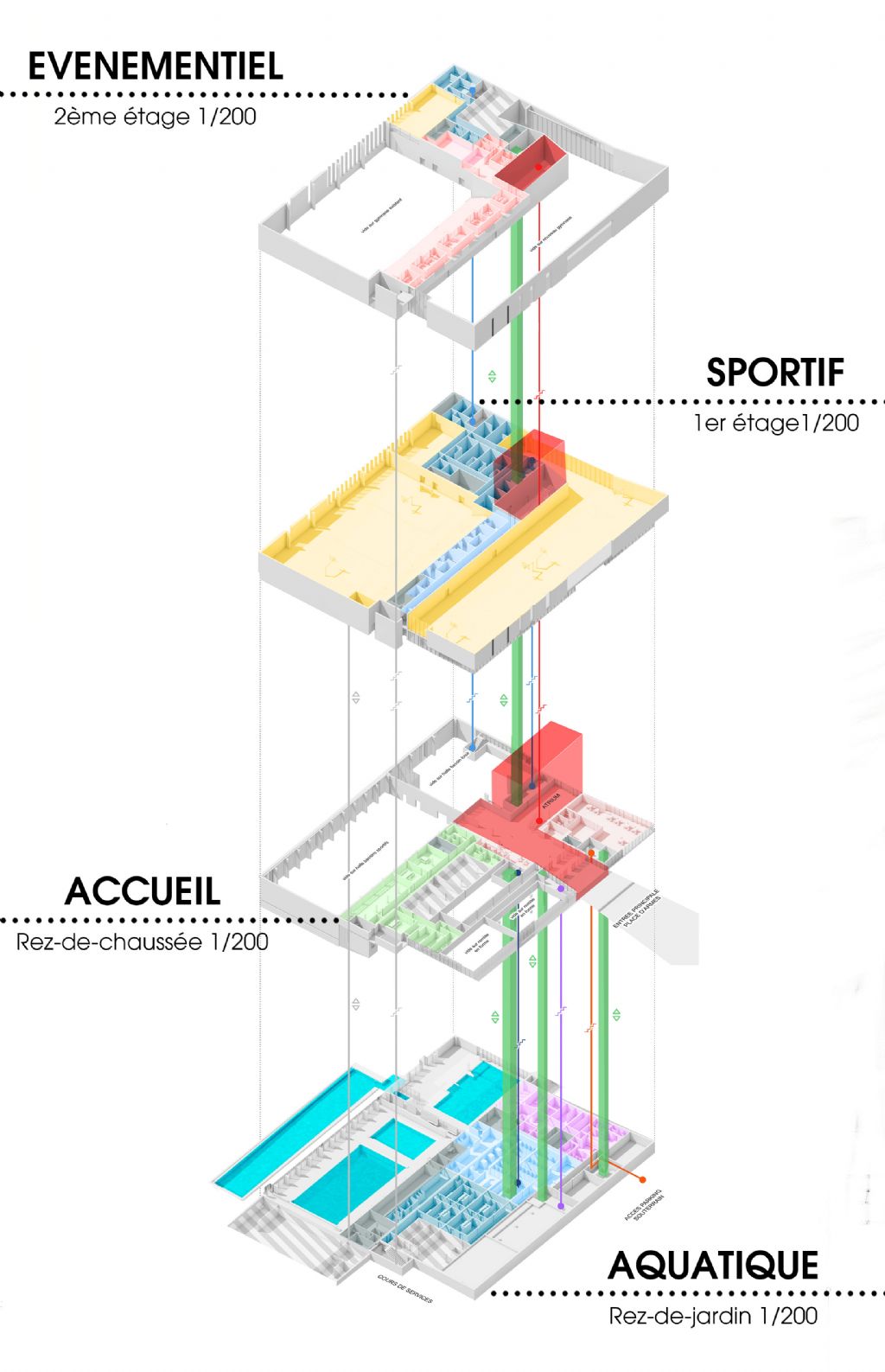 A chaque niveau du complexe – rez-de-chaussée, rez-de-jardin, premier étage et second étage – est attribuée une fonction.