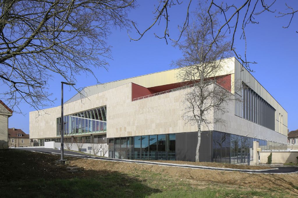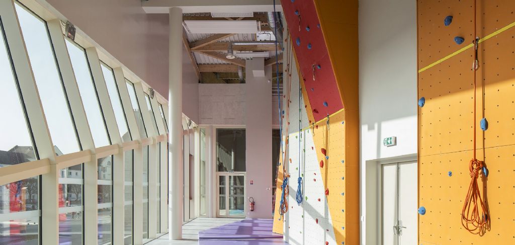 Pour développer l’attractivité du centre-ville, la ville de Dole, dans le Jura français, a opté pour une démarche originale en prenant le parti fort et dynamique de regrouper en un lieu unique, en plein cœur de la ville historique du 18e siècle, d’importantes surfaces sportives à destination des écoles et du grand public. Dans ce bâtiment conçu par les bureaux TNA Architectes et Serge Roux, la stratification verticale est distribuée par un noyau de circulation installé autour... d’une fresque de Vasarely.