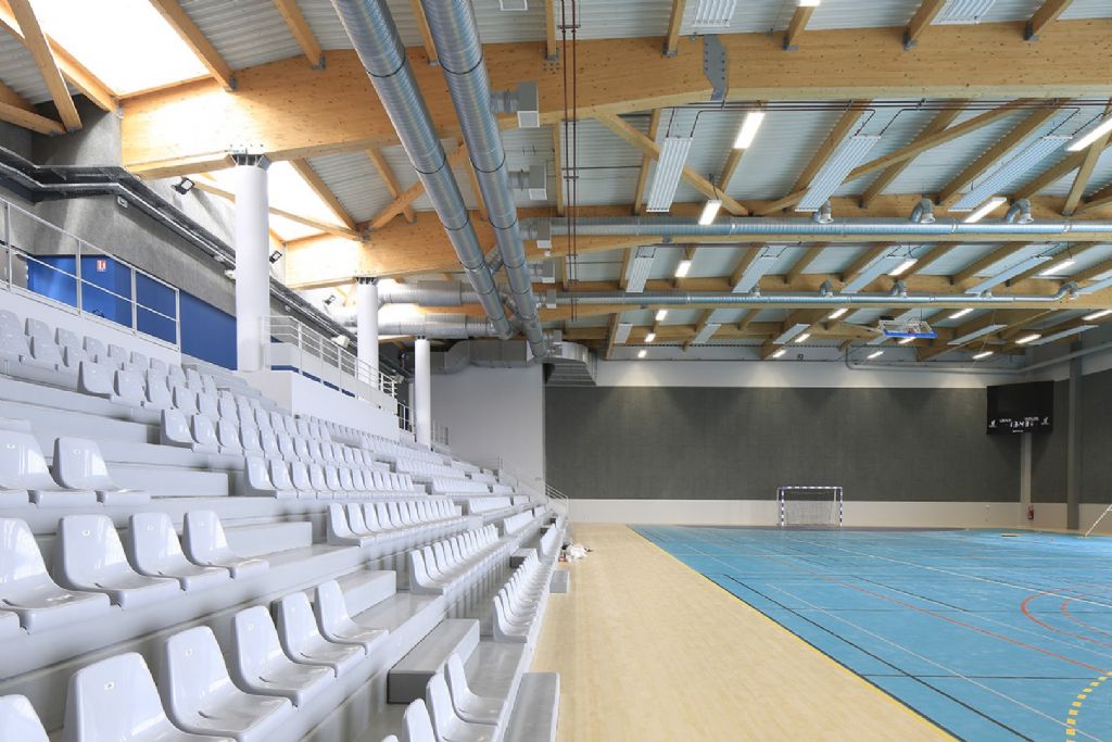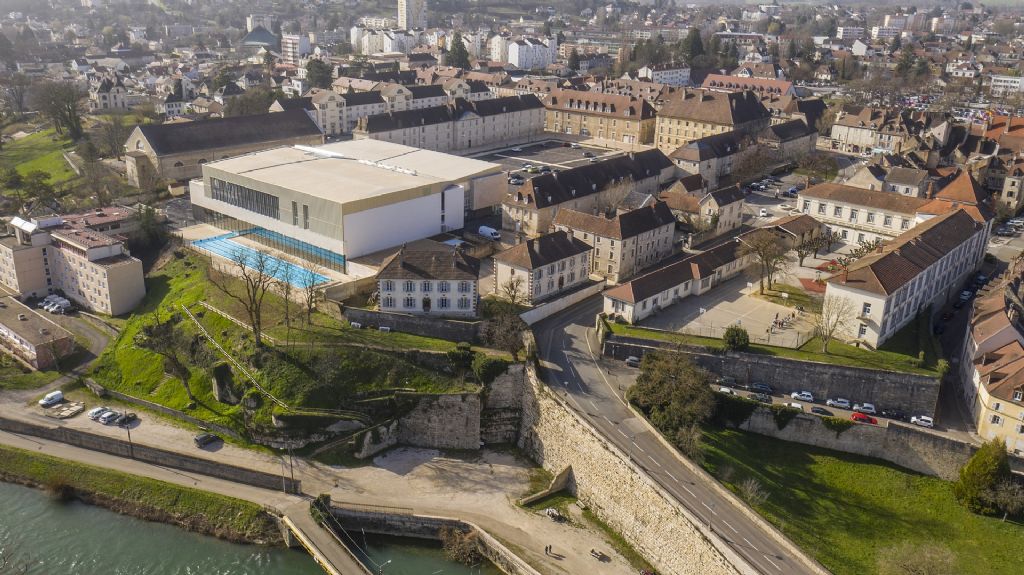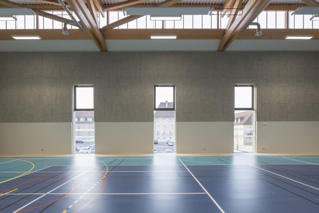 Enfin, le dernier étage a une forte dimension événementielle. D’une part, il donne accès aux gradins du gymnase d’honneur et, d’autre part, il comprend une salle polyvalente qui peut accueillir des cours de gym, de yoga... mais aussi des réceptions. Cette salle possède de beaux atouts pour remplir cette mission, avec ses baies vitrées qui ont vue sur le gymnase d’un côté et sur le Doubs de l’autre, ainsi qu’une grande terrasse...