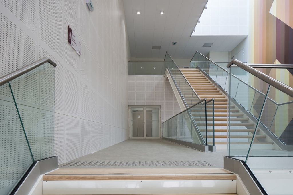 Le rez-de-chaussée, de plain-pied avec la place, est consacré à l’accueil, avec un vaste atrium ouvert sur l’esplanade, et est très lumineux. Tous les utilisateurs de l’équipement passent par là, quelle que soit leur destination. Il distribue tous les niveaux. C’est un peu le 'hub' de l’équipement.