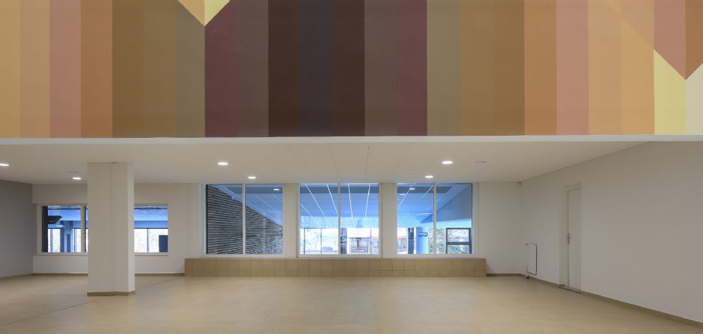 Ce qui frappe dans ce bâtiment de 9600 m², c'est qu'au-delà de cette répartition claire et lisible des fonctions par niveaux distincts, il comprend, dans le hall d'accueil, une longue fresque de Vasarely. Celle-ci guide et rythme le noyau de circulation qui permet la distribution de la stratification verticale du bâtiment. Cette fresque a été restituée à sa place et à sa dimension d’origine exactes, en plein cœur du projet.