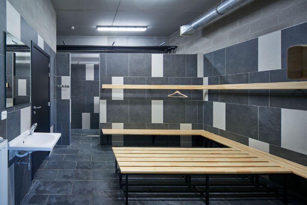 « Architecturalement, le programme prend place dans deux volumes distincts, constituant ensemble un grand prisme parallélépipédique », explique-t-on chez DDV. « L’espace buvette et la salle polyvalente occupent la majorité du second niveau. L’étage supérieur est éclairé naturellement par la grande superficie d’ouverture pratiquée dans l’enveloppe du bâtiment. A l’inverse, le niveau 0, très fermé, comprenant les locaux fonctionnels liés à l’activité du club, est adossé contre le talus existant. »