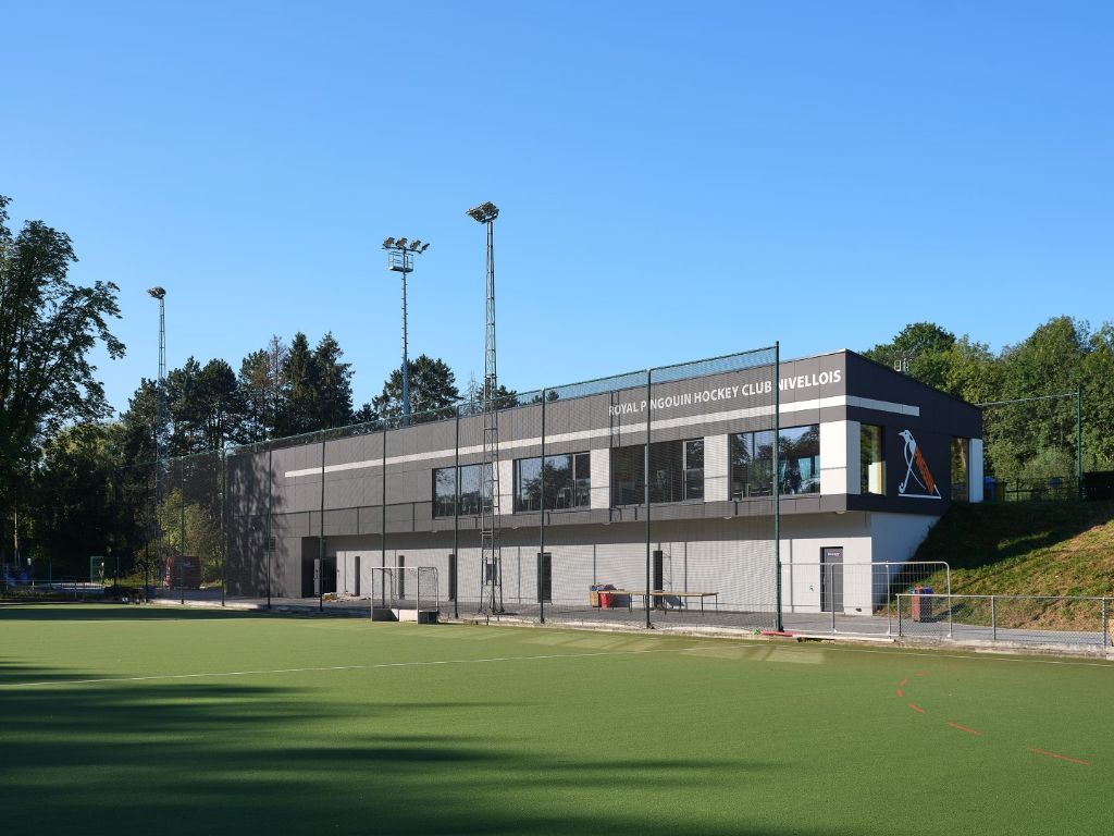 Le club de hocky nivellois Royal Pingouin souhaitait créer une nouvelle infrastructure accueillante à la fois pour les sportifs et le public. Résultat de la conception de l'Atelier d'architecture DDV : un bâtiment préfabriqué béton-bois avec caissons OSB et finition brute, implanté sur un terrain pentu situé entre deux terrains de jeu.