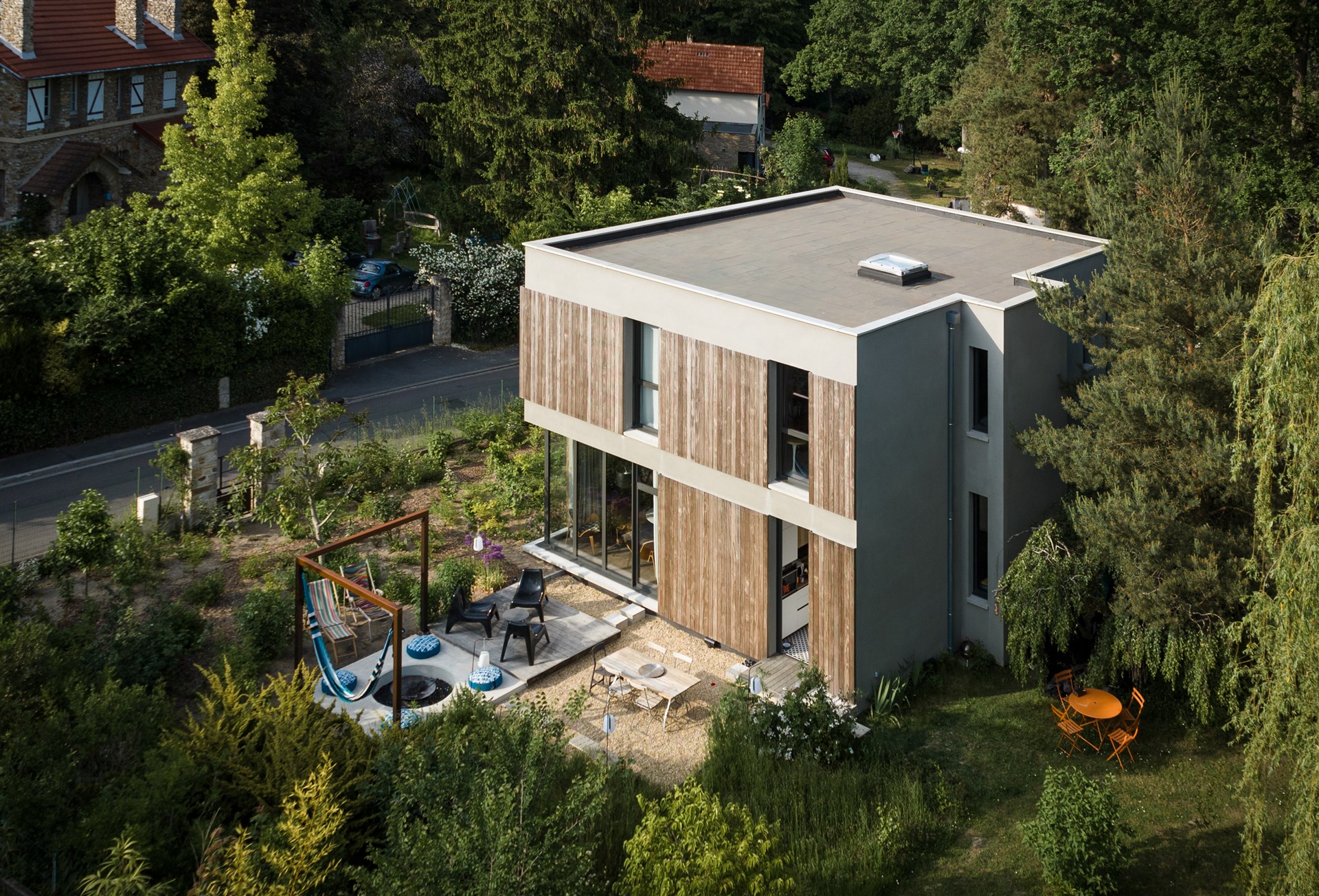 Ce couple d’architectes a choisi le bois Kebony pour habiller sa propre maison, en raison de ses qualités écologiques, durables et esthétiques. Depuis deux ans, des lames de bois Kebony Clear, dont une des propriétés esthétiques est de ne pas avoir de nœuds, habillent ainsi cette nouvelle demeure. De style très contemporaine, le choix des matériaux inscrit naturellement cette maison dans son environnement boisé constitué majoritairement de maisons en pierre de meulière. Le bois Kebony clear marie ainsi matériau naturel et modernité.