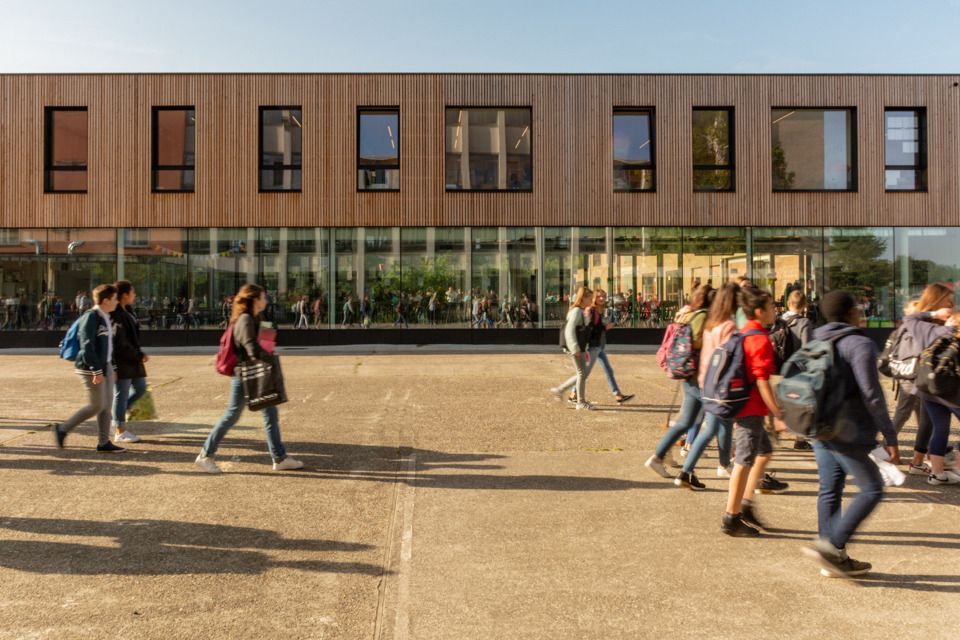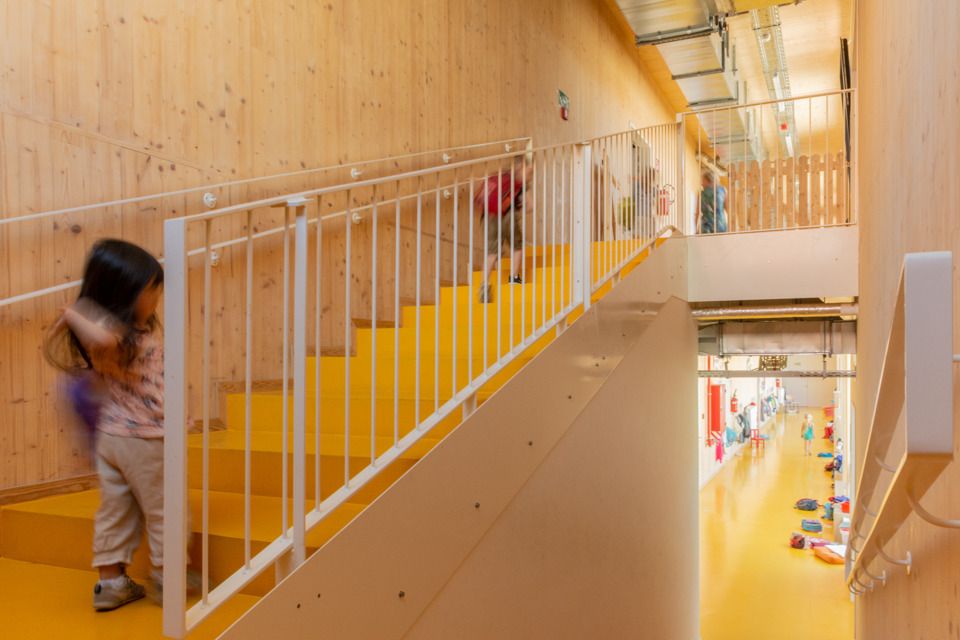 Les espaces de circulations horizontaux et verticaux, tout comme les mobiliers bas et les rangements, sont dimensionnés en fonction des personnes (enfants de différents âges), des salles de classes et des effectifs, de manière à assurer un confort optimal à tous. L'optimisation des volumes et cette impression d'espace ne sont pas le fruit du hasard mais plutôt le résultat d'une simplification de la disposition des techniques habituellement cachées dans un vide difficilement accessible. Laisser ces techniques apparentes permettent de mieux maitriser le budget initial en limitant les coûts mais elles assurent aussi une simplification du budget d'entretien et de maintenance. Si la lumière est un facteur indéniable de bien-être, le confort acoustique l'est tout autant. Afin de permettre au corps enseignant d'assurer les cours dans des conditions optimales, les classes sont équipements de revêtements acoustiques adaptés. Elles ont également des proportions idéales pour maximiser l'attention des élèves. Ce schéma acoustique est systématisé pour les différents volumes du projet où le nombre d'utilisateurs peut considérablement augmenter.