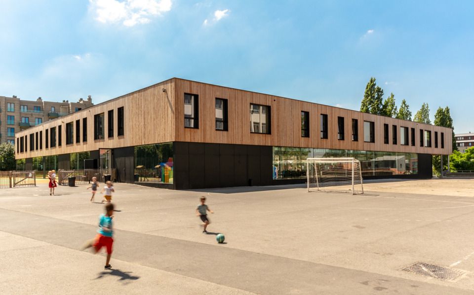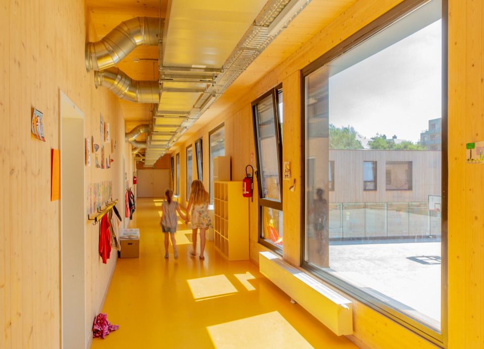 Ce projet a été réalisé avec un phasage complexe. Un système constructif rapide et efficace a dû être envisagé. Après réflexion, les architectes ont orienté leur choix sur une structure de panneaux en bois "massif" type CLT. Ces panneaux présentent en effet une multitude d'avantages. Ils réduisent énormément les nuisances sur l'environnement (école existante en fonctionnement pendant les travaux), génèrent moins de bruit et moins d'émanation de poussières. Ils réduisent également les délais de construction sur place (3 semaines pour 2 000 m2). En matière de durabilité, le bois est une matière renouvelable avec un écobilan positif qui n’engendre qu’une quantité restreinte de déchets sur chantier et qui requiert peu d’énergie de production. Alors que le site était occupé par les élèves et le corps enseignants, ces choix ont permis de mettre l'école en service 365 jours après les travaux de démolition et de reconstruction.