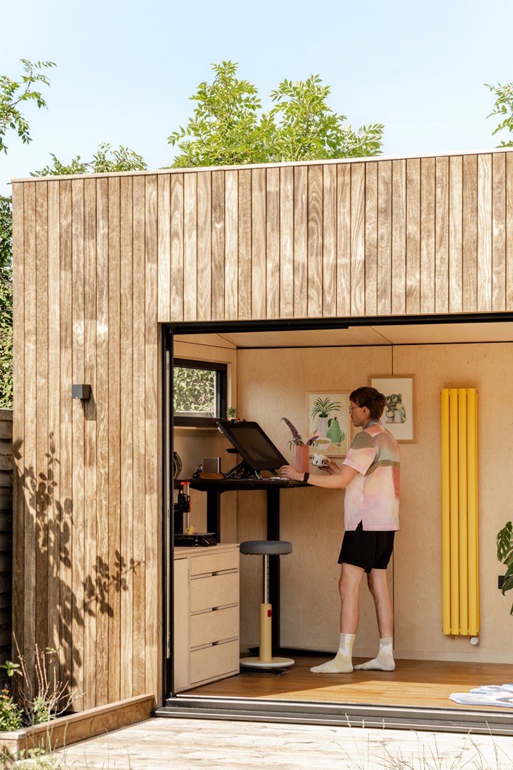 Mattias Brietholz, designer, qui a emménagé près de Londres en novembre 2022, explique : « Avec ma partenaire, nous avions de plus en plus de mal à faire la distinction entre la maison et le bureau. Avoir un espace dédidé pour se consacrer pleinement à nos projets était un rêve de longue date. »