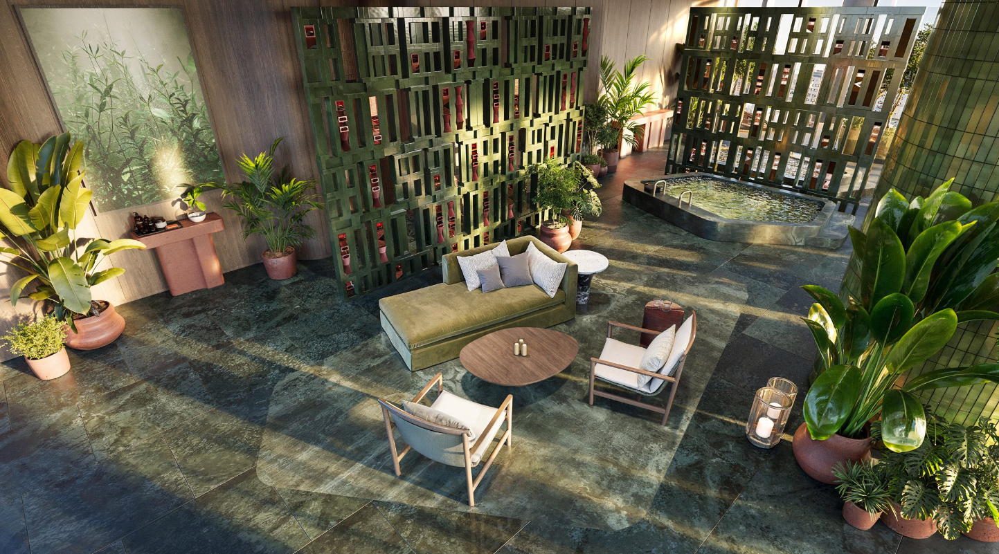 Le design intérieur, imaginé par Yabu Pushelberg, fait écho au climat tropical de Miami grâce à des teintes de vert, des matériaux naturels comme le bois et la pierre, et une intégration harmonieuse de la végétation. George Yabu, co-fondateur de Yabu Pushelberg, explique : « Ayant vécu à Miami, nous avons vu la transformation de ce quartier. Nous sommes inspirés par ce projet qui marie la nature luxuriante de la ville à sa culture vibrante. »