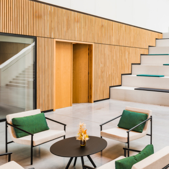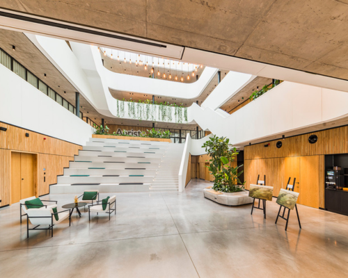 L’atrium central du nouveau bâtiment accueille les clients, les candidats potentiels – ou les « Potatoholics », comme Agristo les appelle – et la société permet même aux associations locales d’y organiser des événements. L'immeuble de bureaux moderne se devait de refléter le caractère familial et l'ambition internationale d'Agristo. Pour l’intérieur, cela signifie l’utilisation du bois comme matériau de construction chaleureux, la présence de plantes, des meubles accueillant et une transition harmonieuse entre les surfaces.