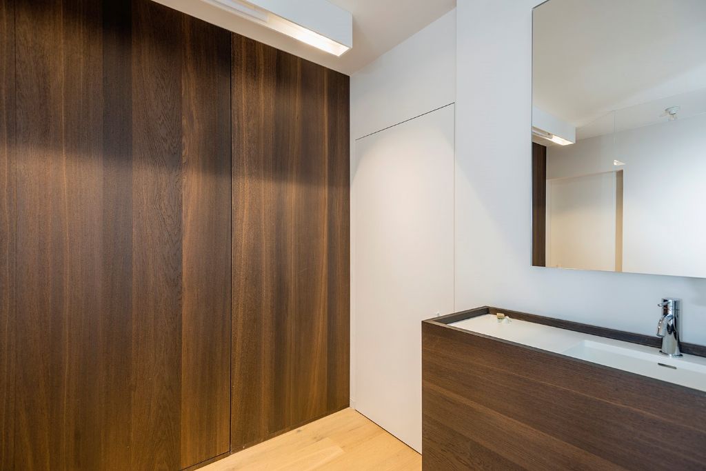 Les propriétaires d'une maison à Waregem voulaient un intérieur épuré dans lequel les portes et les plinthes ne se font pas remarquer. Le résultat ? Un mélange de portes invisibles battantes, pivotantes et coulissantes qui ne sacrifient en rien au look minimaliste. Mieux encore, avec des plinthes à peine visibles, l’architecte d’intérieur Thomas Nachtergaele n’a clairement fait aucune concession dans ce domaine.