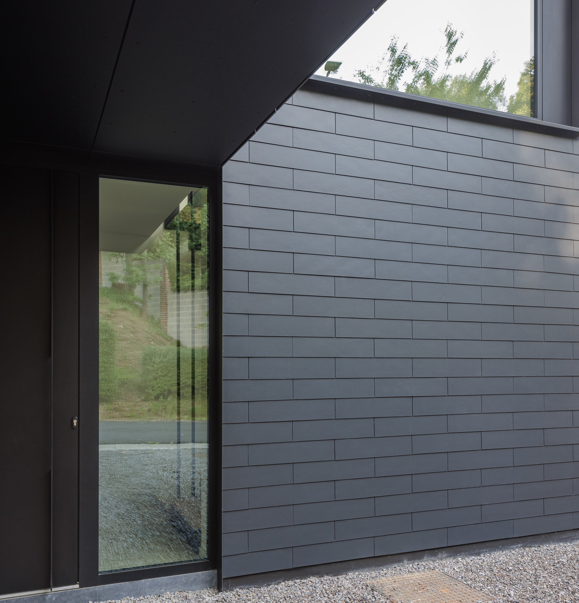 L’architecte a opté pour les ardoises Cedral, teinte Gris foncé, pour d’autres raisons. « L’ardoise Cedral nous permettait de faire une pose de type maçonnerie, à double recouvrement. Les ardoises sont clouées, mais la disposition ne laisse aucune fixation visible. Le rendu visuel est semblable à la brique, ce qui nous a aidé lors de la demande du permis de bâtir, vu que beaucoup de maisons du quartier sont en brique », renseigne Quentin Falque.