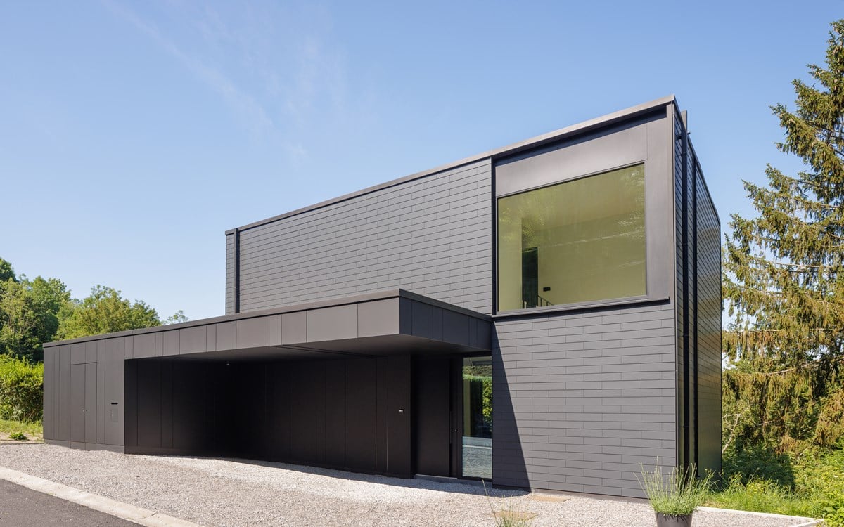 Les ardoises Cedral offrent donc un rendu contemporain, qui souligne parfaitement le volume simple de la maison et l’intègre parfaitement dans un environnement arboré.
