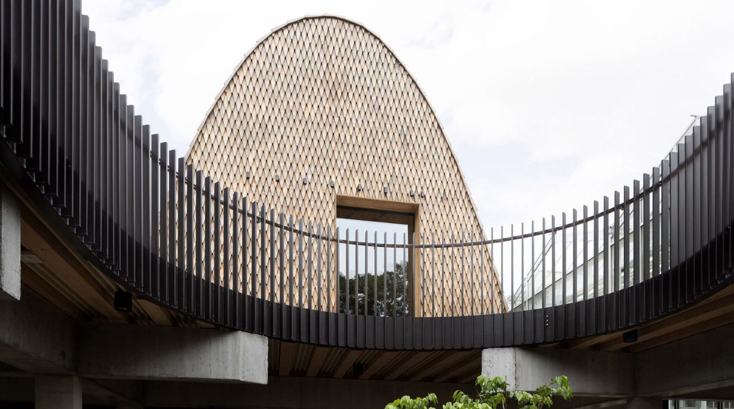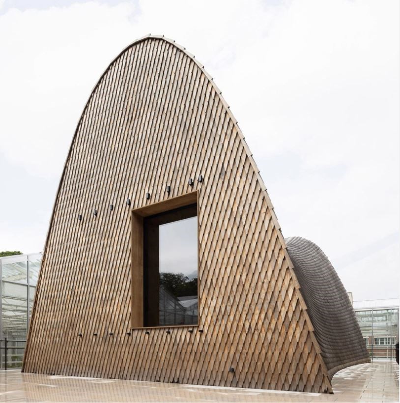 Les bureaux belges NU Architectuuratelier et Archipelago ont conçu un centre d'accueil innovant pour le Jardin Botanique de Meise, situé près de Bruxelles, couronné d'un toit voûté recouvert de bardeaux.
