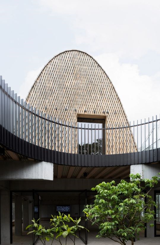 Le reste de l'Arche Verte est abrité sous un toit en béton qui sert également de terrasse. Cette terrasse offre aux visiteurs des vues sur les niveaux supérieurs des serres et sur les arbres environnants. Du centre de cette terrasse en béton émerge le toit voûté, qui est recouvert à l'extérieur de bardeaux en bois de Kebony, créés à partir de bois de récupération provenant d'autres projets du studio.