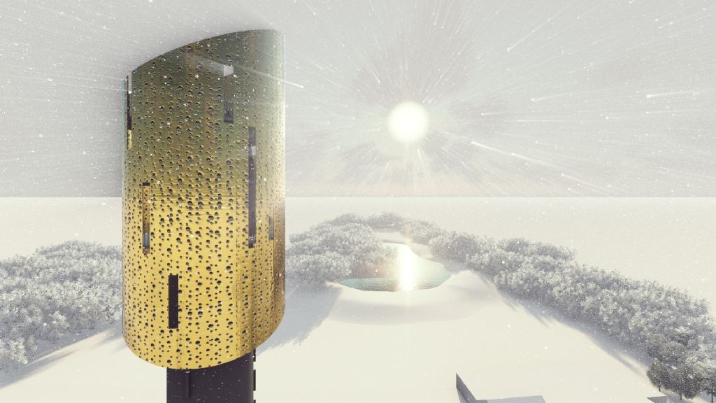 « Quant à la partie supérieure, nous n'en fermons pas l'enveloppe .Nous allons créer trois plateaux en réduisant la surface de 200 à environ 50 mètres carrés exploitables par plateau. Ceux-ci seront extérieurs, ouvrant des points de vue sur le paysage. Un bureau d'études est à l'oeuvre actuellement, notamment pour calculer la prise au vent, importante à cette hauteur. L'idée est de travailler avec un bardage métallique ajouré, avec des perforations de diamètres variables, de manière à garantir au visiteur une certaine transparence vers le paysage. A certains endroit, nous allons créer des ouvertures verticales offrant des points de vue spécifiques sur le paysage de la Famenne. Cette peau métallique a de nombreux avantages : une perméabilité réduisant la prise au vent, une perméabilité visuelle également, une fonction garde-corps et enfin la possibilité de créer un jeu de lumières la nuit, grâce à un rétro-éclairage de l'intérieur. »