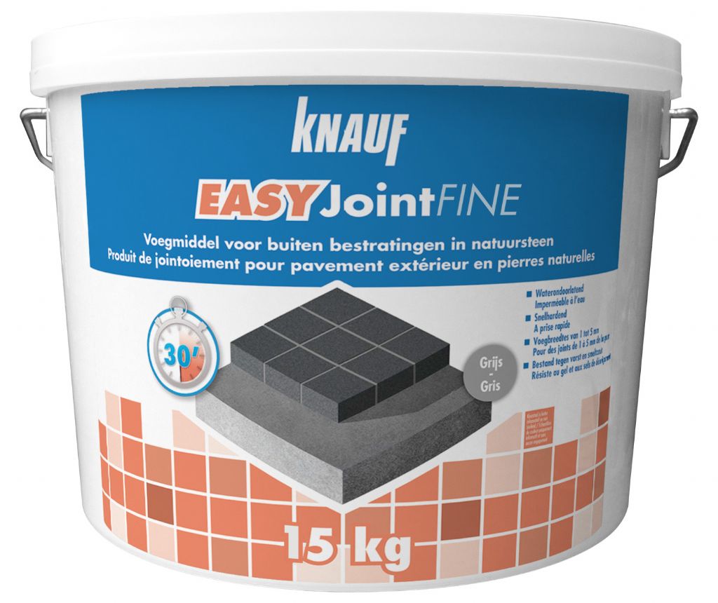Terrasses, sentiers, allées de garages ou places de parking : le mortier minéral Knauf EASYJoint FINE convient parfaitement pour le remplissage des joints fins de pavés en pierres naturelles ou terre cuite et des dalles de grand format. Le produit est auto-compactant et peut dès lors s’utiliser pour réparer des joints endommagés, à condition que le pavement et le support soient stables.