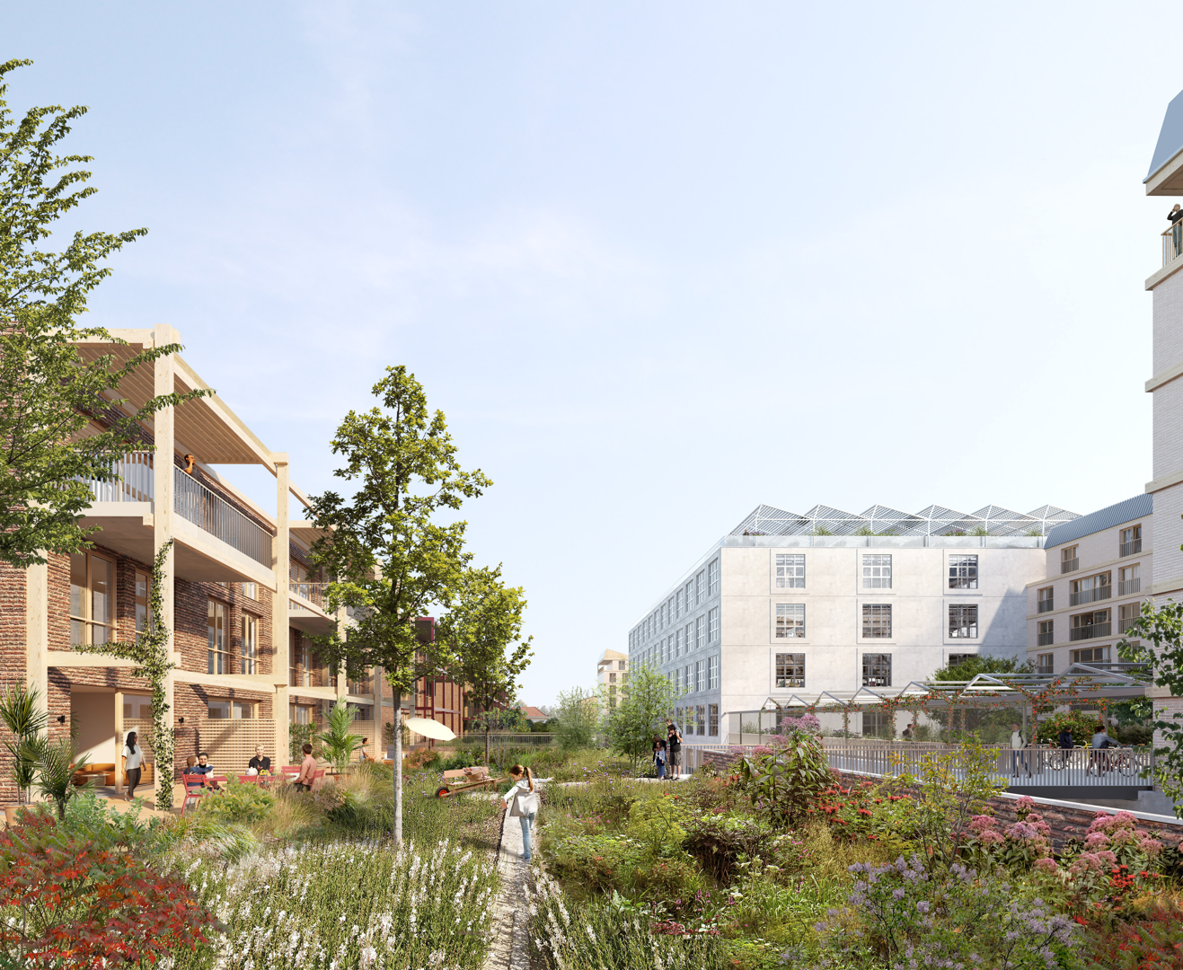 Les trois angles du site sont activés par des espaces publics qui deviendront de véritables pôles urbains attractifs pour le quartier (un parvis rassemblant des activités commerciales, une place verdoyante avec des aires de jeux et de repos, le parking silo avec un hub logistique et énergétique). La conception de l’ensemble des espaces paysagers est très réussie. Le lauréat propose un jardin verger public central qui servira de liaison verte entre le site et le quartier. D’autre part, des jardins collectifs sur socle seront reliés par des cheminements intérieurs et des ponts qui favoriseront les rencontres.