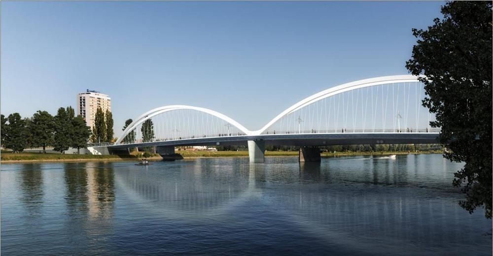 Arcadis et Marc Barani Architectes étaient chargés de la conception de l’ouvrage. La pose des tabliers du pont a nécessité de prévoir, plusieurs mois en amont, l’arrêt durant une journée du trafic sur le Rhin, fleuve pourtant le plus exploité en Europe pour la circulation fluviale de marchandises.
