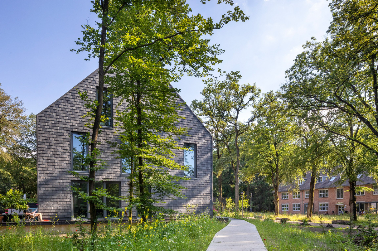 Les terrasses en ardoise grise, conçues par MVRDV, abritent des maisons à structures en bois avec parking souterrain et terrasses donnant sur le paysage naturel environnant. Pour répondre aux différents besoins des habitants, les plans des maisons varient, allant de configurations sur trois étages à des niveaux décalés.