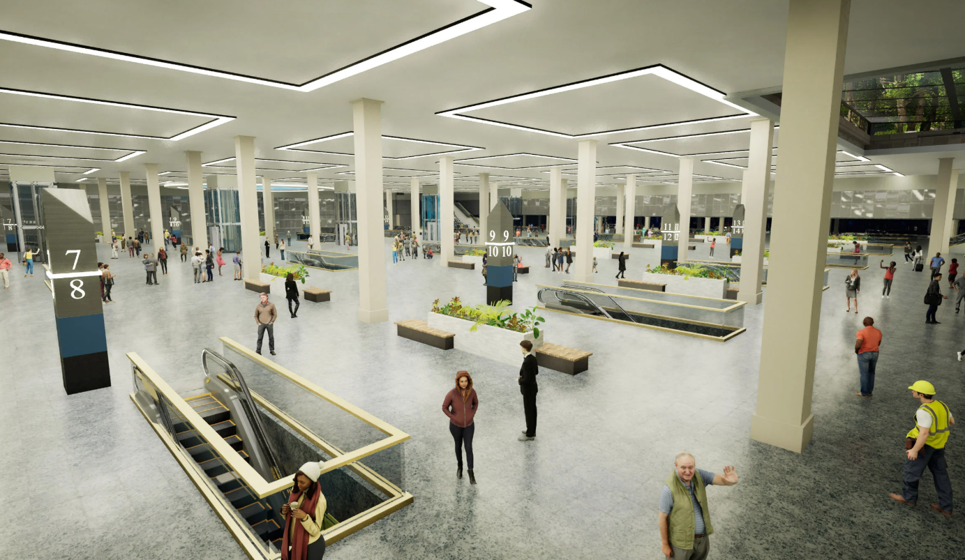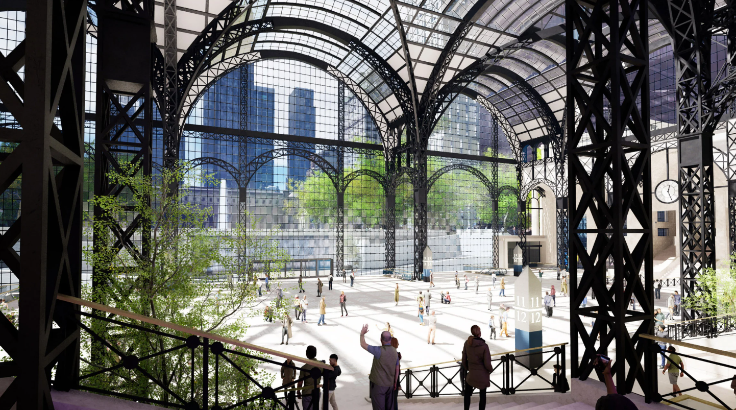 L’entrée principale serait dotée d’un atrium en verre, conçu comme un pont entre les éléments classiques de la future gare et les besoins contemporains en matière de transport. Cette verrière rappellerait les vastes halls lumineux de la Penn Station originelle, démolie dans les années 1960 pour faire place à la structure actuelle.