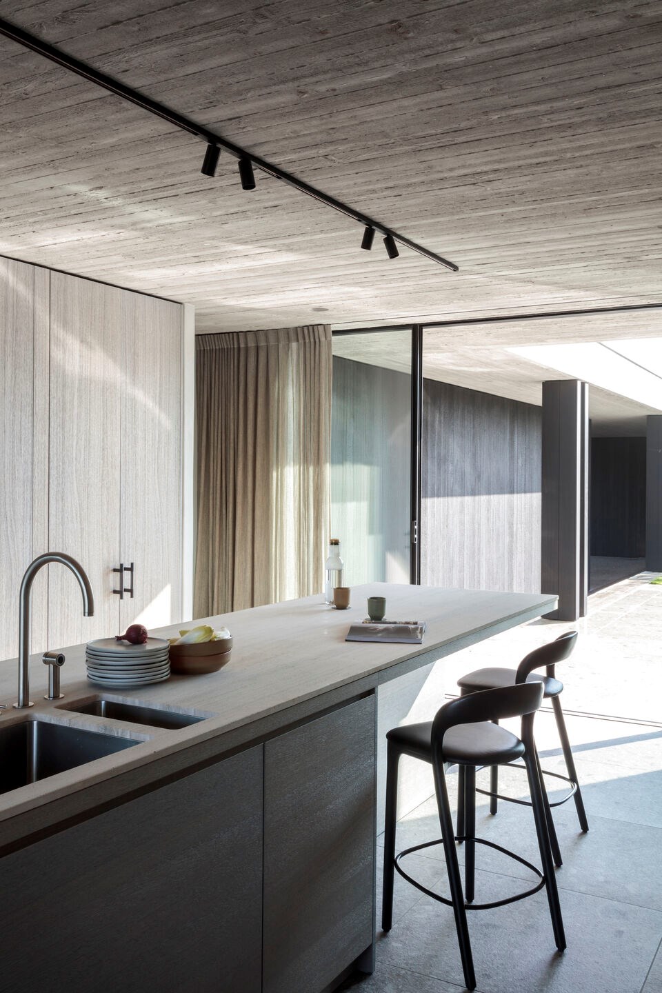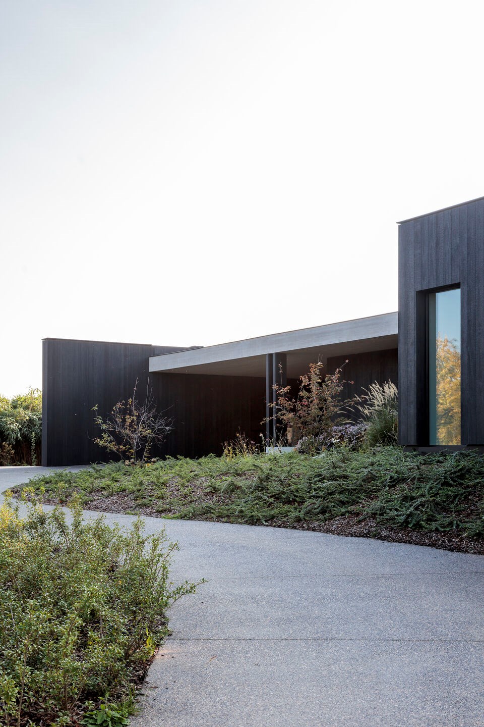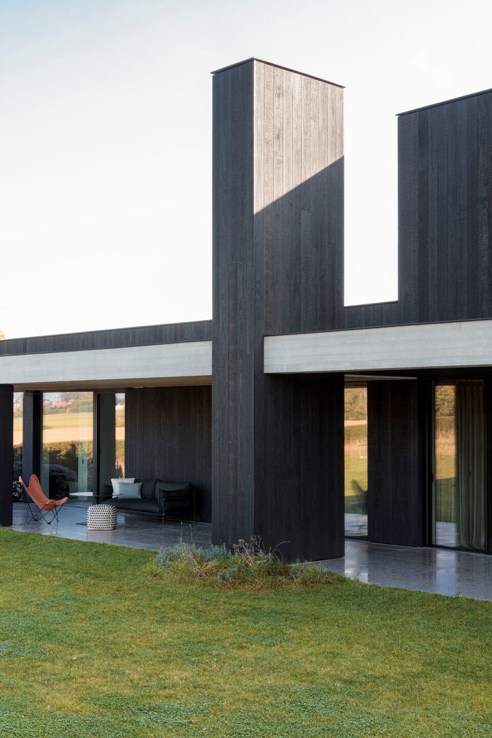 Le côté nord de la parcelle offre une vue imprenable sur les champs environnants avec, au loin, de pittoresques clochers d'église. En contraste avec ce cadre ouvert, la piscine à débordement, posée comme un miroir sur la terrasse, demande une orientation sud et une protection contre les éléments.