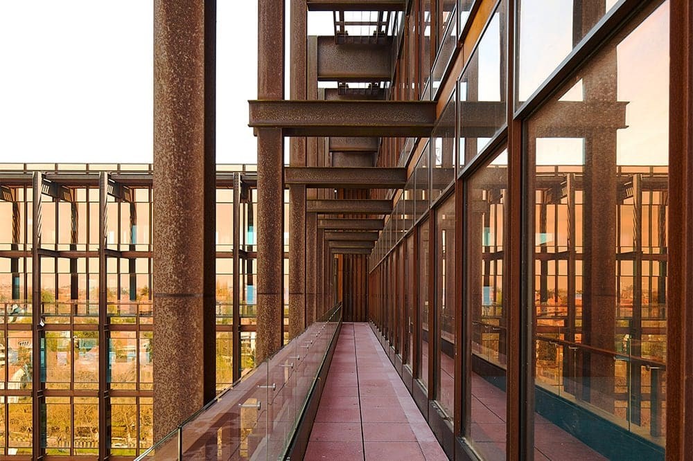 CIT Blaton s’est vu confier la mission d’entreprise générale en août 2021. « Après avoir mis à nu l’ensemble du bâtiment, nous avons entièrement rénové les façades en remplaçant les structures secondaires en acier Corten et l’ensemble des menuiseries et des vitrages – y compris ceux du socle – en étroite collaboration avec notre sous-traitant Kyotec Group. Les structures primaires en acier Corten, les profils qui soutiennent toute la partie en croix du bâtiment sur les poutres en béton au sommet du socle, faisaient partie de la structure porteuse du bâtiment, nous les avons donc laissées en l’état. Les garde-corps en acier Corten autour des terrasses du niveau 2 ont également été rénovés en grande partie », précise Daan Watté. « Nous avons également rénové l’étanchéité des toits plats et réalisé une isolation performante. »
