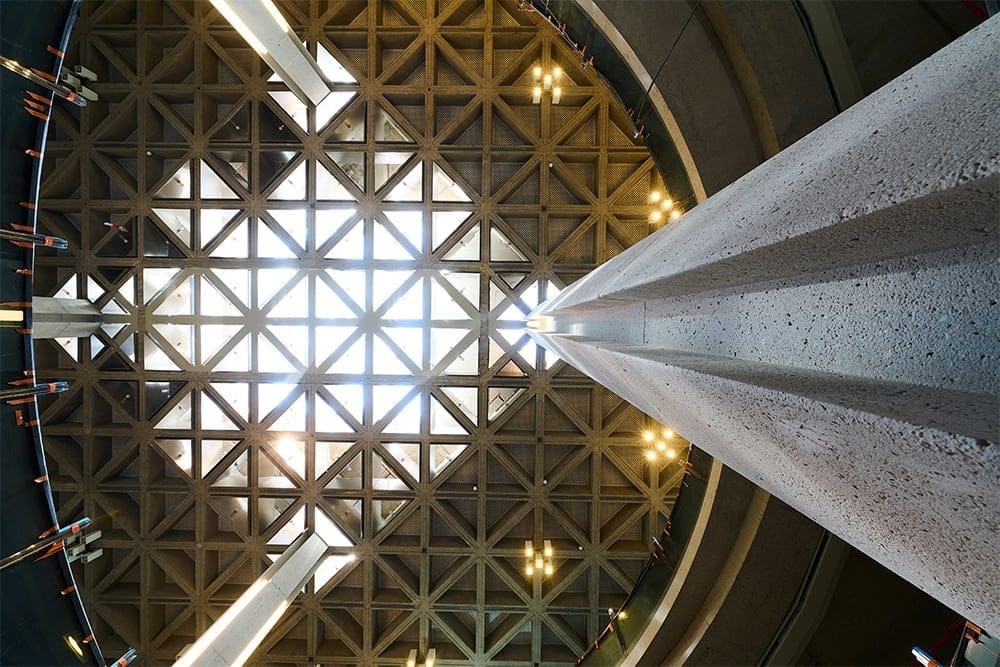 « Ce fut également le cas pour la réalisation de l’atrium – avec une nouvelle circulation périphérique – au sein de la structure existante. Un tour de force de notre part, si j’ose dire. Nous avons dû démolir les structures porteuses adjacentes et les remplacer par de nouvelles, sans toucher aux éléments de construction spéciaux tels que le marbre blanc dans les murs et les sols. Dans le cadre d’une coopération très étroite entre notre département d’ingénierie interne, le bureau de stabilité Ellyps et le bureau de contrôle SECO, un système spécial de soutien et de consolidation a été conçu pour réaliser à la fois la démolition et les nouvelles structures. À l’emplacement des futures colonnes de béton, quatre colonnes d’acier ont été placées pour soutenir temporairement la structure en poutres du toit. En dessous, d’autres éléments porteurs ont été démolis jusqu’au rez-de-chaussée. Nous avons alors réalisé les imposantes nouvelles colonnes de béton et les nouveaux murs, auxquels un escalier flottant a été suspendu. Les murs ont été réalisés avec une composition de béton qui devait se rapprocher de l’ancien béton. Après avoir décoffré le béton, les murs ont été sablés. Enfin, les planchers ont été ‘bétonnés’ sur les murs en béton pour les rendre porteurs. »