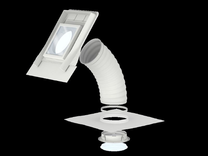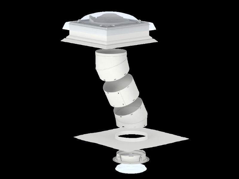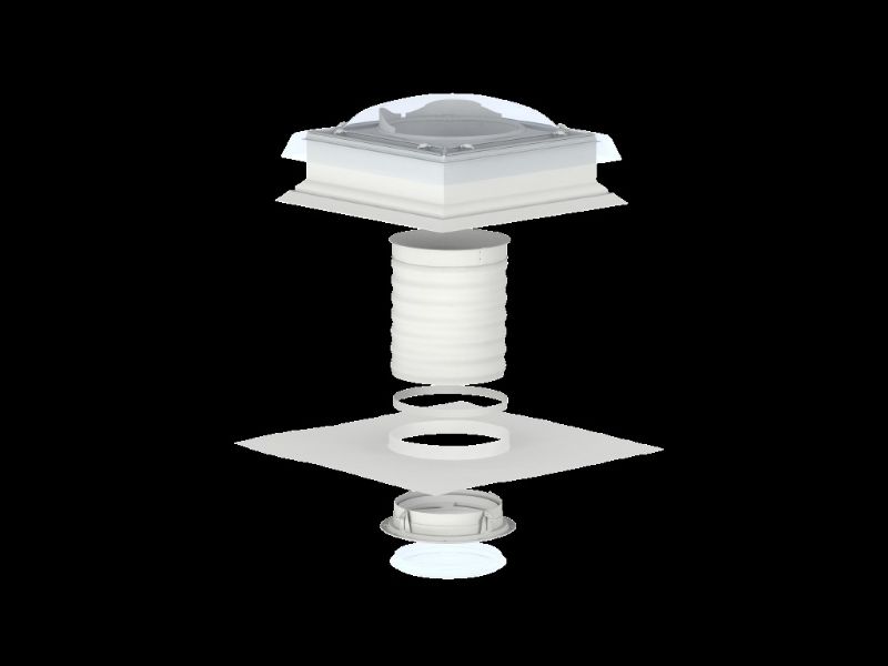 Le nouveau système Flexi-loc permet un assemblage simple et rapide des tubes du conduit. Ces derniers sont raccordés entre eux par l’intérieur. Un anneau de connexion, qui se fixe au module du toit, facilite le raccordement aux tubes. Le cadre amovible contribue également à simplifier l’installation extérieure.