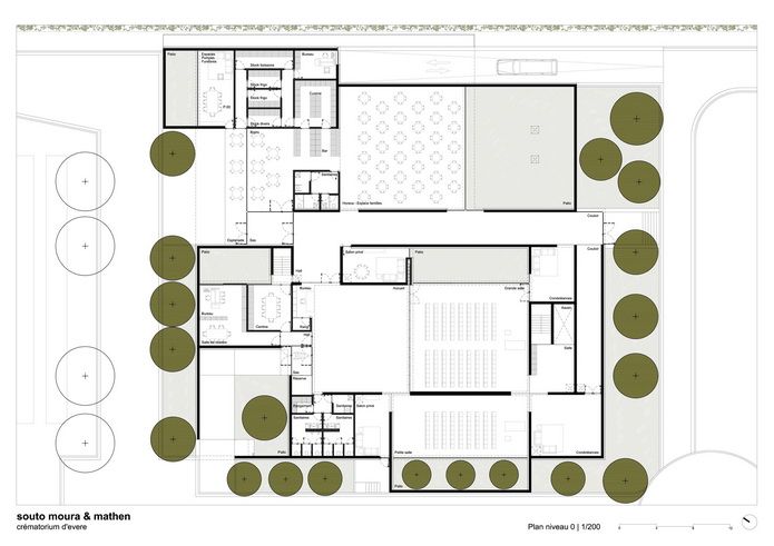 Les maîtres d’ouvrage souhaitaient une qualité architecturale sous la forme d’une intégration maximale dans le paysage et le respect dû à ce lieu unique. Déjà en 2012, le crématorium de Courtrai se fondait dans le terrain, se faisant discret. Ici aussi, l'édifice en béton prend la mesure du lieu, bordé d'une frange verte, protégeant l'espace du recueillement. L'entrée se fait sur l'angle, au croisement de l'axe principal du cimetière et d'un chemin, au travers d'un patio, auprès d'une fontaine. L'accès, en légère déclivité, convie familles et proches. Le patio se fait préface, préambule propice à s'inscrire dans le recueillement. L'espace accueille, dessert les salles de cérémonie baignées de lumière naturelle, pouvant s'unifier avec le foyer, pour les grandes assemblées.