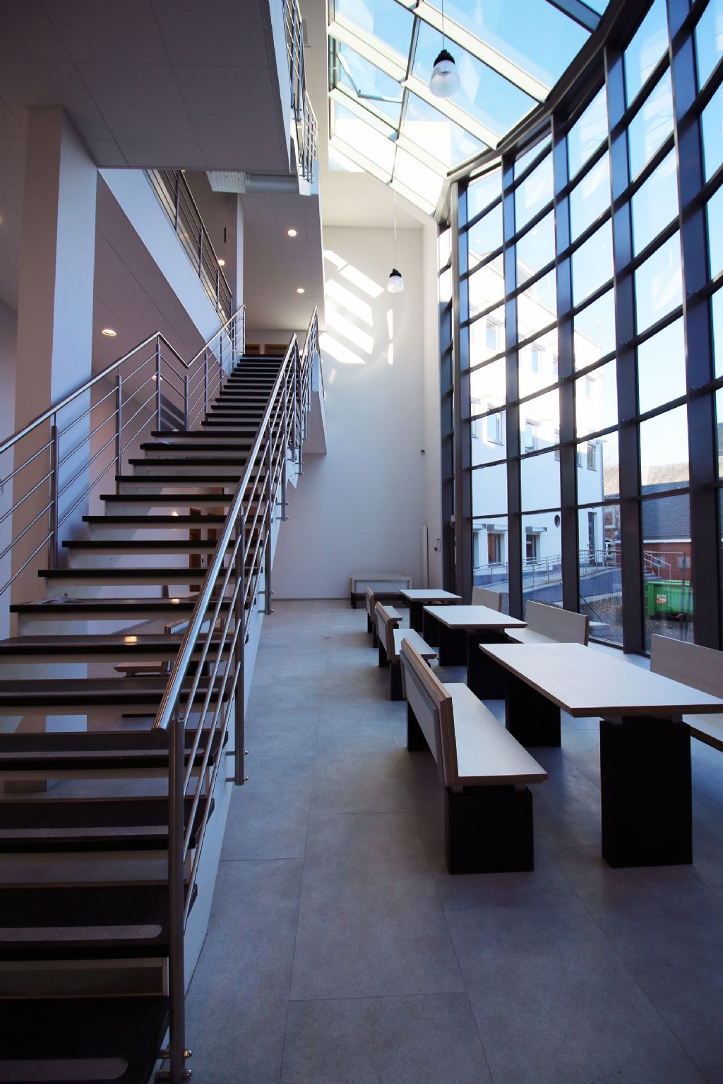 La rénovation est signée par le bureau ixellois Arcade Archi. Le nouveau complexe se présente comme une continuité du tissu urbain existant. La volumétrie se raccorde parfaitement aux bâtiments voués à être conservés et rénovés. Les matériaux choisis, à savoir le crépi clair, les grands pans vitrés, la pierre bleue et l’acier, apportent un véritable aspect contemporain.