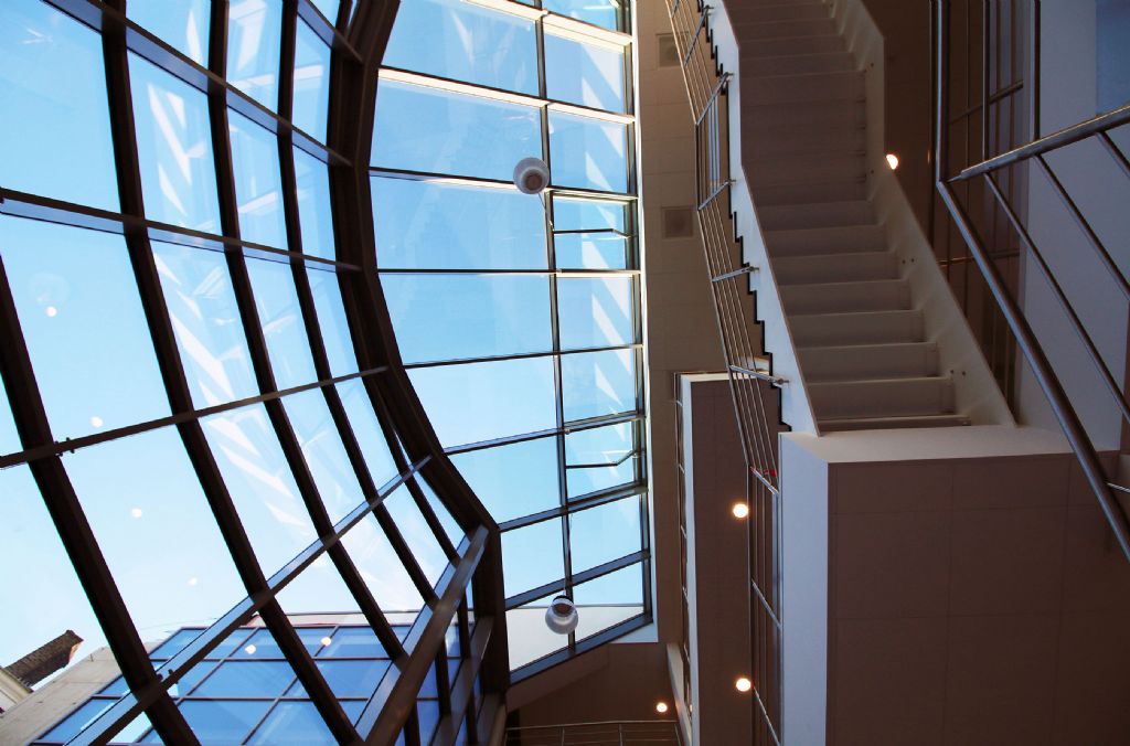 L’entrée, marquée par une grande entaille vitrée, est clairement identifiable et hautement symbolique : la justice est transparente et ouverte à tous. Cette entrée donne accès à la salle des pas perdus, généreusement éclairée par une verrière s’ouvrant sur une cour intérieure. Les 4 salles d’audiences se regroupent autour de cette salle des pas perdus.