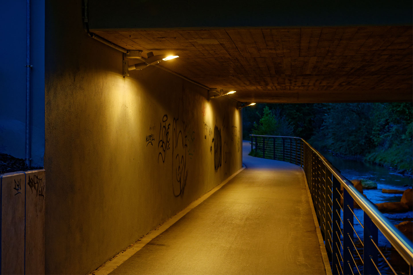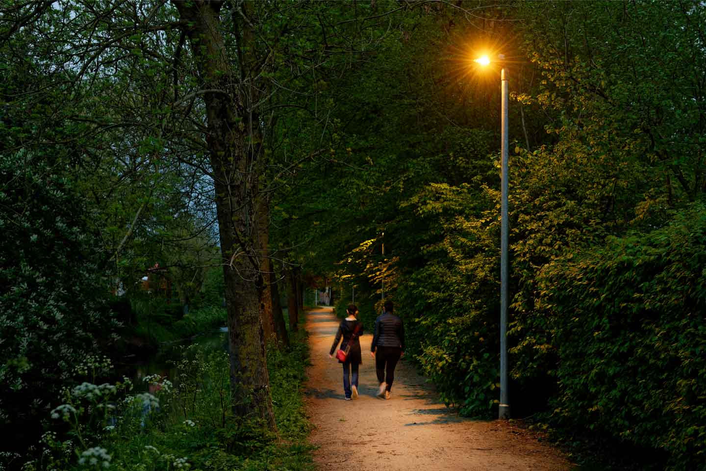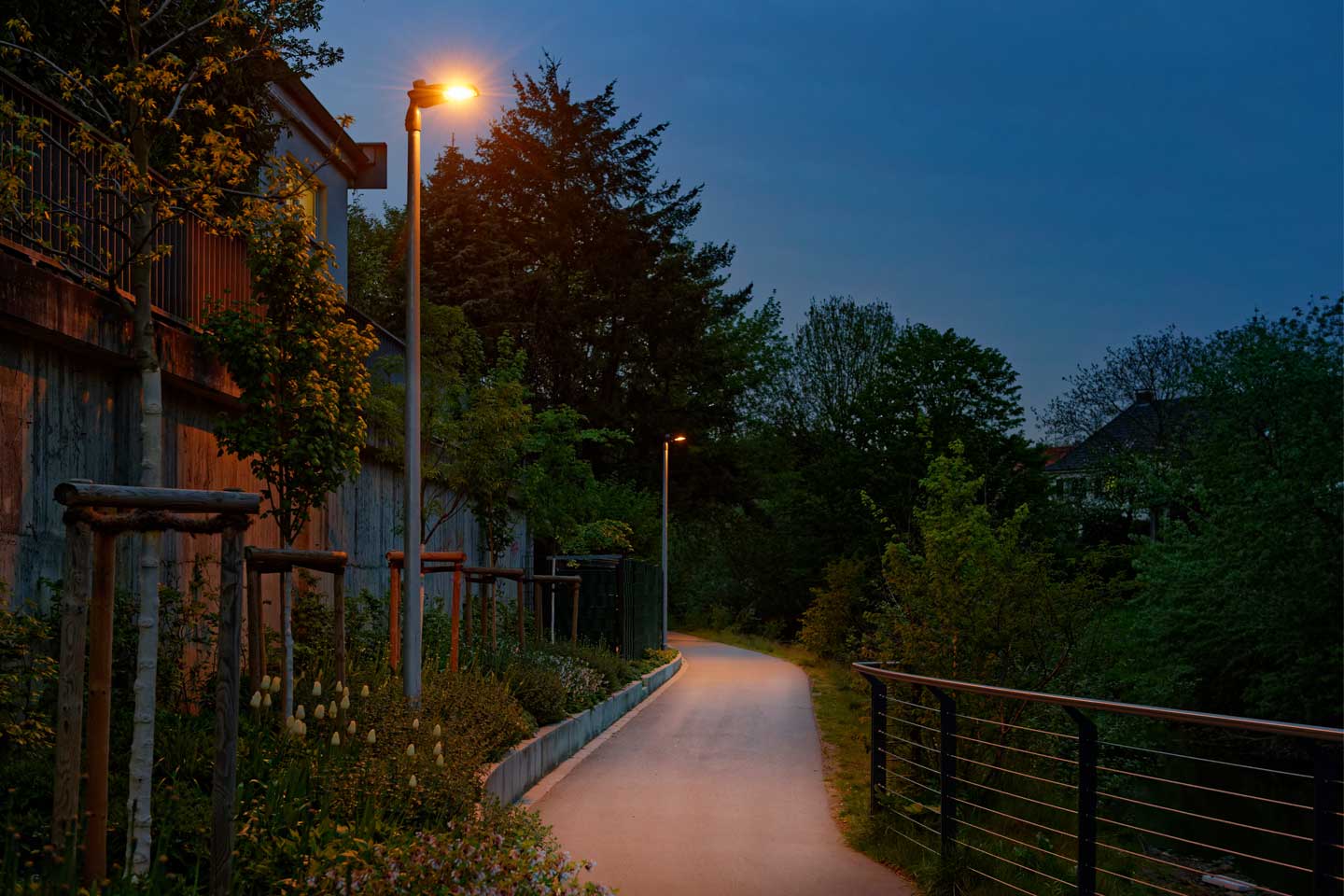 Pour le ré-éclairage de la piste cyclable qui longe la Borkener Aa, le cahier des charges préconisait un système d'éclairage adaptatif, doté de capteurs de mouvement afin de minimiser les heures de fonctionnement des luminaires.