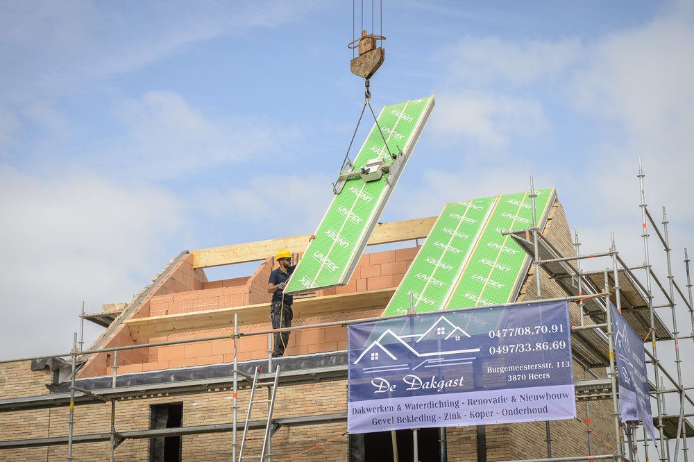 Pour la finition des toits, Gilen Woonprojecten travaille avec un seul couvreur. Les éléments, composés d'un noyau en EPS indéformable, étant autoportants, le couvreur peut couvrir un toit entier en 2 jours avec seulement 2 ouvriers, y compris les liteaux et la finition de toit. Seuls deux hommes sont nécessaires sur le chantier pour exécuter toutes les opérations, sans machines lourdes supplémentaires. Une fois les pannes posées, on peut placer les panneaux à un rythme soutenu au moyen d'un crochet de levage hydraulique et de vis autoperceuses. De plus, toute la longueur, du faîte à la sablière, en passant sur les pannes, est franchie avec un élément de toiture autoportant.