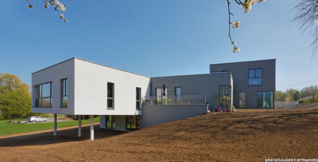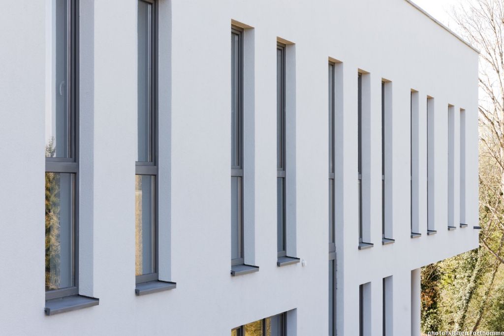 Le rez-de-chaussée est habillé par une couche d’enduit de couleur gris clair appliquée sur isolant, tandis que le premier étage est de couleur gris plus foncé. Toutes les toitures sont des toitures vertes extensives. Les châssis sont en aluminium, avec un double vitrage. Les performances énergétiques se traduisent par une utilisation parcimonieuse du sol et une attention particulière portée à la mobilité. Le terrain a été également été utilisé de manière optimale tout en laissant une large zone verte commune en fond de parcelle. A l’extérieur, des aménagements tels que des rangements pour vélos favorisent la mobilité douce. La récupération de l’eau de pluie est assurée par des citernes tandis que les toitures vertes sont utilisées comme tampon avant la récupération de l’eau dans la citerne et son rejet vers le réseau public. Les citernes d’eau de pluie et toitures vertes ont aussi été prévues pour lutter contre la surcharge du réseau d’égouttage existant. Enfin, un maximum de zones vertes et revêtements de sol perméables ont été aménagés.