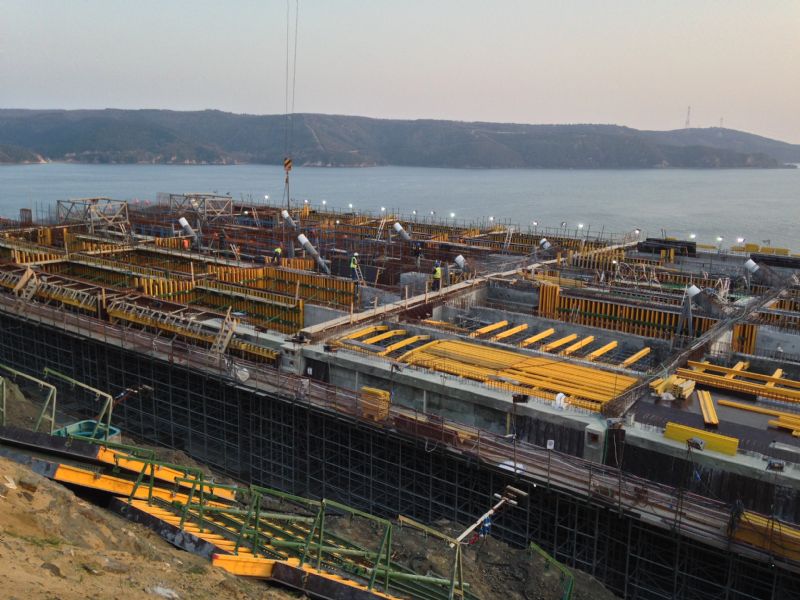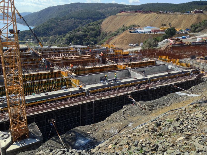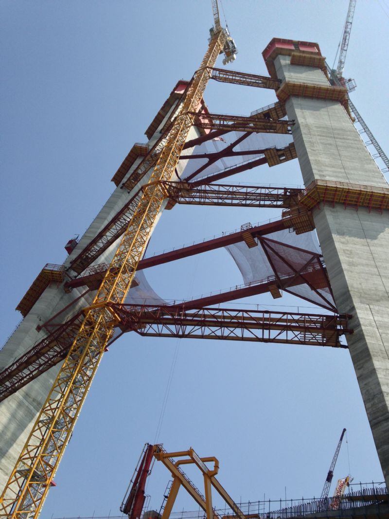 Le chantier a démarré au printemps 2013, par les terrassements et les blocs d’ancrages du pont, sur les rives. Plus récemment, les travaux des travées d’approche ont débuté ainsi que ceux des impressionnants pylônes. Avec une hauteur finale de 320m, ils compteront parmi les plus hauts du monde. Actuellement, plus d’un quart des travées d’approche du pont est réalisé et les pylônes présentent déjà 2/3 de leur hauteur. Leur construction s’est déroulée à raison de 2 mètres par jour, en continu, à l’aide d’un coffrage glissant. En partie haute, la tête d’ancrage sera réalisée avec un coffrage auto-grimpant. La réalisation du tablier devrait commencer après l’été, par la méthode d’encorbellement pour les parties proches des mâts et par suspension au câble principal et amenée par voie d’eau pour la partie centrale. En parallèle de l’assemblage consécutif des éléments du tablier, la mise en place des haubans assure le maintien des pylônes et l’avancement du tablier au-dessus du détroit. La réalisation complète du tablier devrait se clôturer en juin 2015. Suivront alors les réglages, les travaux de voirie et d’aménagement ferroviaire.