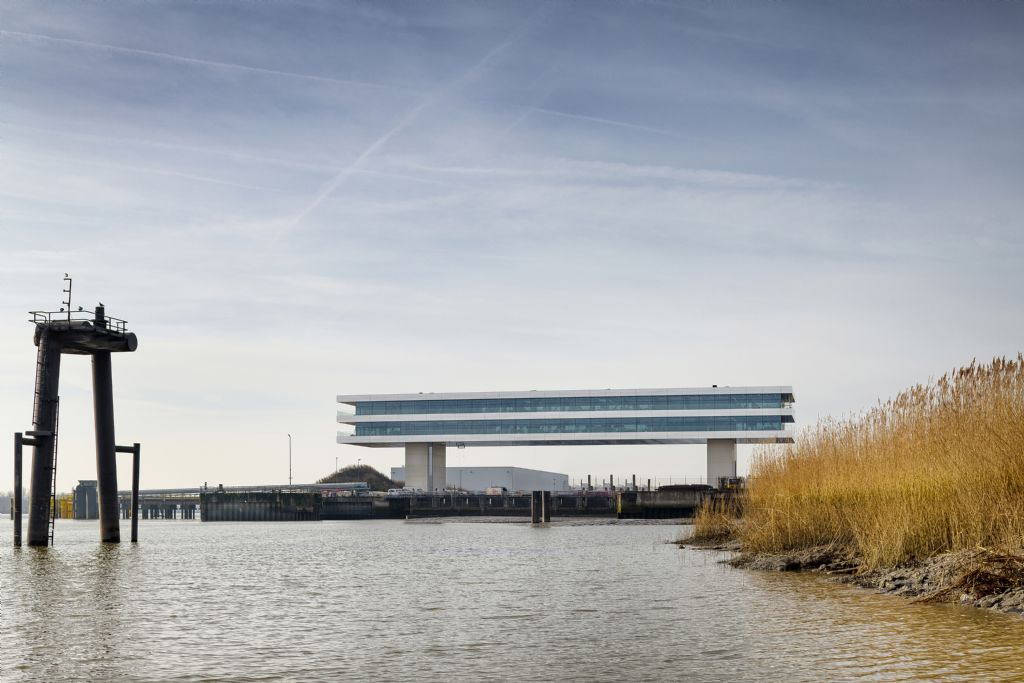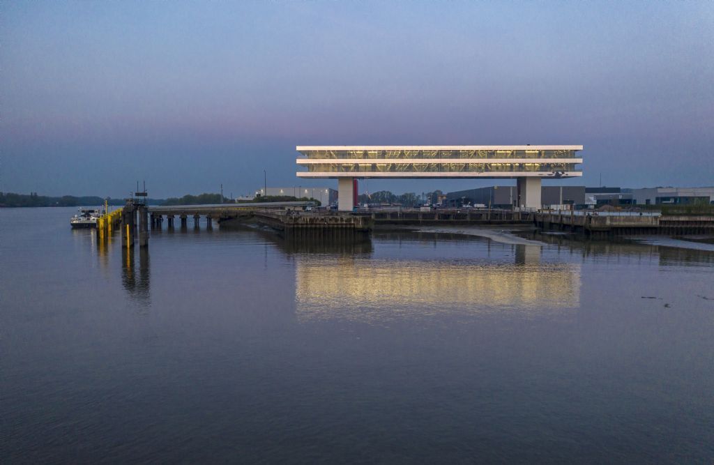 Avec ses dimensions de 108 m sur 26, le bâtiment allongé attire inévitablement le regard. Le volume principal repose sur deux pieds en béton dans lesquels sont intégrés deux escaliers et deux ascenseurs. La portée intermédiaire est de 72 m. « Cela n’a pas été une sinécure de tout placer au-dessus de l'eau et de l’assembler », souligne Gert Hoefnagels. « Nous avons opté pour le prémontage de la structure en treillis d’acier (1 200 T) à la fin de la cale sèche, structure que nous avons hissée sur les points d’appui à l’aide de grues spéciales venues de l’étranger et de réaliser ensuite les finitions. Un autre élément important résidait dans le risque d’une certaine déformation à cause de la grande portée. Au milieu, le bâtiment a baissé de 14 cm par rapport au moment où il a été hissé… Afin de pouvoir placer correctement les nombreuses vitres et les autres matériaux sensibles, nous avons procédé à un lestage de la construction pour les amener à leur position finale, de sorte que le poids puisse être systématiquement compensé lors de la finition ultérieure. Pour l'installation du revêtement de façade, nous avons installé un échafaudage à partir du bas de la cale sèche, et donc en partie sous l'eau. La finition intérieure a pu ensuite être réalisée de manière traditionnelle. Malgré les difficultés et les défis liés au travail en hauteur, les travaux de construction se sont déroulés sans encombre et nous avons pu rapidement utiliser nos nouveaux bureaux. Et tout le monde est très satisfait du résultat ! »