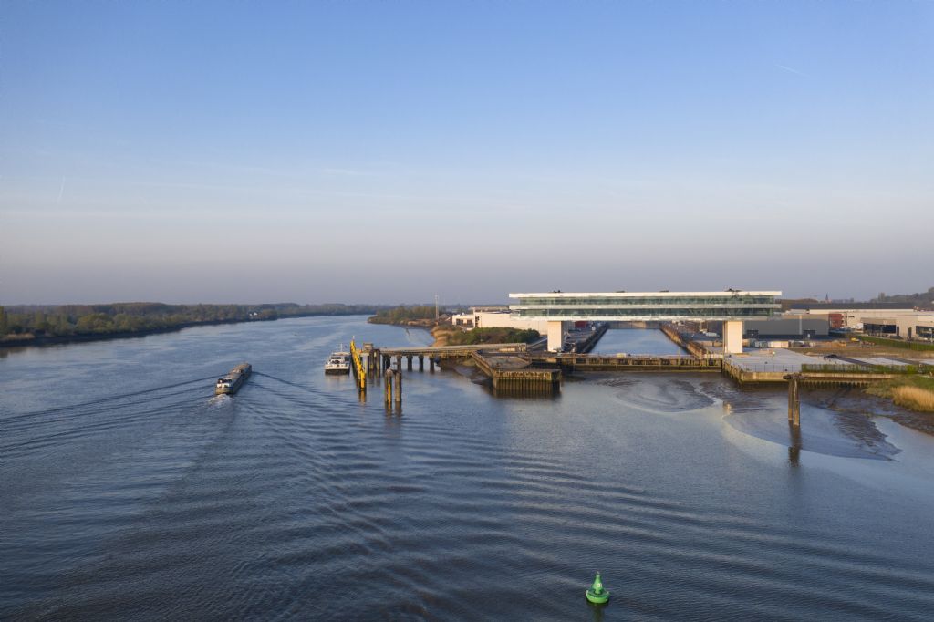 Le tout nouveau siège social possède deux étages. Les salles de réunion et les bureaux individuels sont implantés sur les côtés extérieurs. La partie centrale est conçue comme un espace paysager avec divers lieux de discussion et de collaboration, ce qui s’applique parfaitement à un travail flexible et aux autres principes propres aux nouvelles méthodes de travail. À l'extrémité sud, on trouve au niveau 1 une salle polyvalente divisible (comprenant une cafétéria avec cuisine et espace de détente) et au niveau 2 une zone spacieuse pour la direction (comprenant une grande salle de conférences). Le bâtiment est complètement entouré de terrasses d’1,5 m de large, prolongées aux extrémités jusqu'à respectivement 3 m (côté nord) et 5 m (côté sud). « La conception a été entièrement élaborée avec le BIM, de sorte que nous avons pu éliminer préalablement au chantier les risques de conflits. Le squelette en acier et toutes les ouvertures requises ont été précisément dimensionnés à l'avance afin de ne pas affaiblir inutilement la structure de base, bien que l'ensemble soit aussi suffisamment flexible pour permettre des modifications ultérieures (sur base d’une taille de module de 3,6 m) », explique Nick Verbeeck . « Ce qui est particulier, c'est que les techniques (les pompes et les réservoirs pour les sprinklers, le groupe d'alimentation de secours, l’installation électrique et le groupe de ventilation) sont entièrement logées dans une station de pompage souterraine de la cale sèche. Elles arrivent, de manière très discrète, à tous les endroits du bâtiment via des gaines dans les noyaux en béton et des renfoncements dans la structure en acier. ”