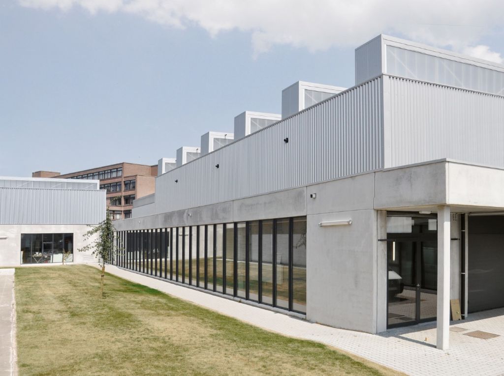 Les techniques de construction et la matérialisation ont été pensées en fonction de l’usage et répondent à des contraintes budgétaires et techniques, tout en contribuant à l’architecture et au rayonnement du bâtiment: le soubassement a été conçu entièrement en béton préfabriqué et contraste ainsi avec la structure légère en acier des parties supérieures. Des doubles treillis permettent la réalisation de grandes portées et facilitent l’apport de lumière zénithale dans les ateliers. Cette opposition entre le soubassement et les parties saillantes est renforcée par le choix des revêtements de façade : béton préfabriqué et tôle en acier ondulé.
