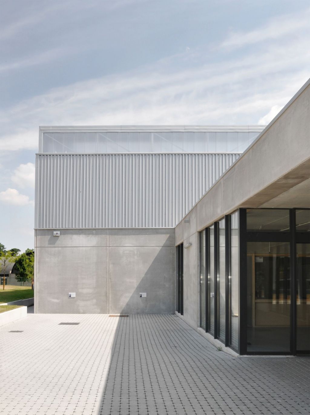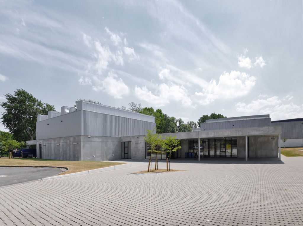 Le projet découle de plusieurs parti pris. Le premier est une implantation réfléchie, rattachant le bâtiment à son environnement, tout en contribuant à mieux le structurer. Les ensembles d’arbres à haute tige le long du ruisseau à l’arrière de la parcelle, ainsi que le réseau de chemins d’accès existants ont structuré cette démarche. Le bâtiment se développe autour d’un nouvel axe, connecté à l’intersection principale du campus et menant vers un nouvel accès de service et une zone de déchargement. A l’intérieur du bâtiment, ce nouvel axe se manifeste comme une rue intérieure couverte et non chauffée. L’entrée principale s’ouvre sur un parvis situé à l’intersection des cheminements.