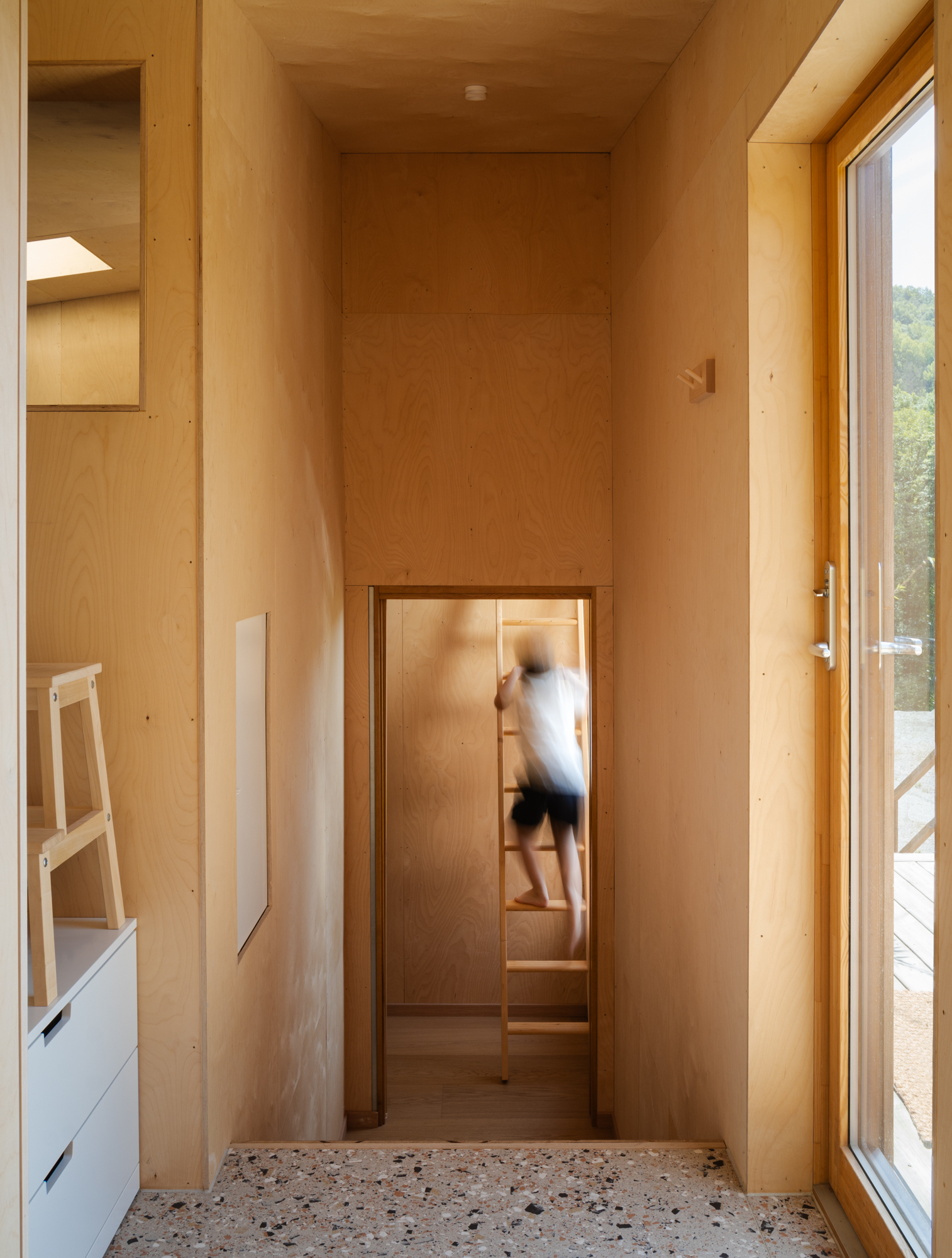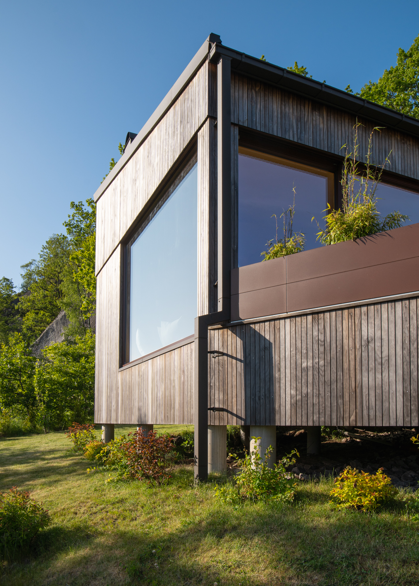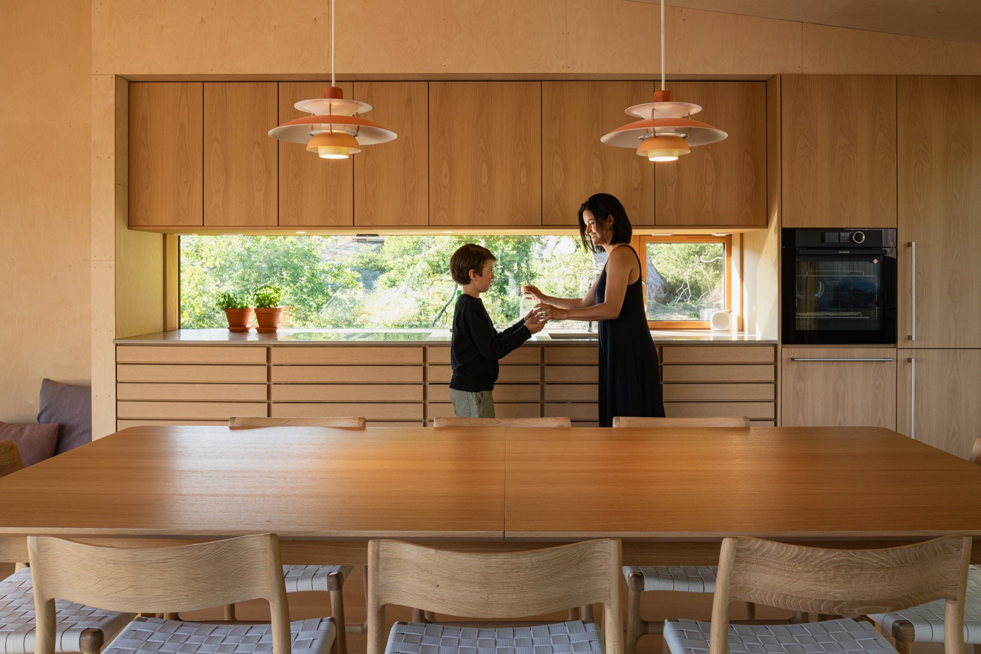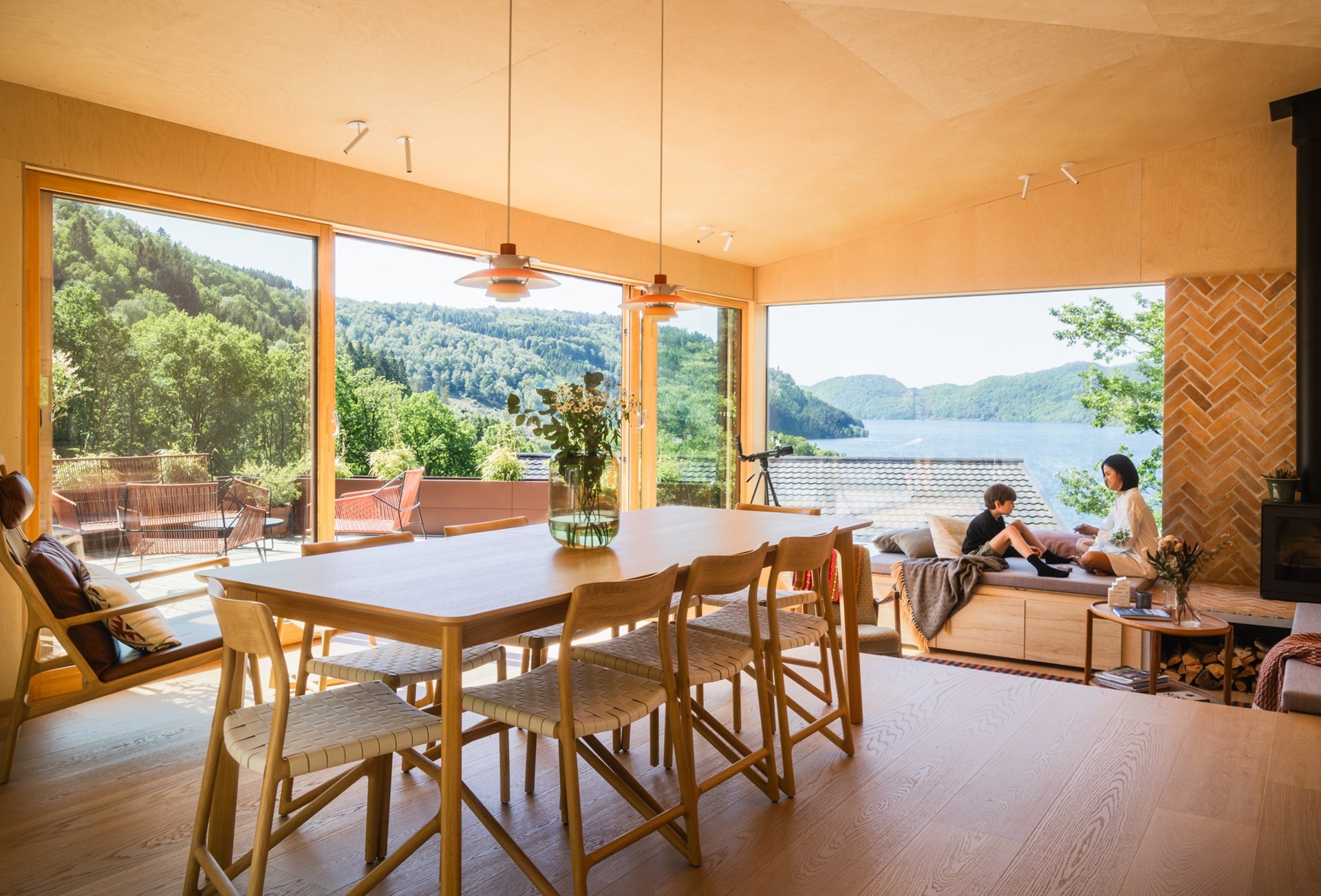 L’objectif était de construire une maison qui soit architecturalement intéressante et fonctionnelle, tout en adhérant aux principes clés de la durabilité et de l’intégration dans le paysage environnant. Le chalet, qui ne s’étend que sur 90 m², comporte trois chambres, une cuisine ouverte sur un salon, une salle de bains, un couloir, un grenier et deux terrasses. Ces dernières ont également été réalisées en Kebony Clear, créant ainsi une harmonie entre le sol des terrasses et la façade. De grandes fenêtres et des baies vitrées offrent une vue sur la mer, tout en invitant la nature et la lumière du jour à l’intérieur. Toutes les pièces, à l’exception de la salle de bains et de l’espace qui entoure la cheminée, sont revêtues de contreplaqué. Presque tous les meubles ont été fabriqués sur mesure spécialement pour le chalet, afin d’optimiser l’espace et sa fonctionnalité.