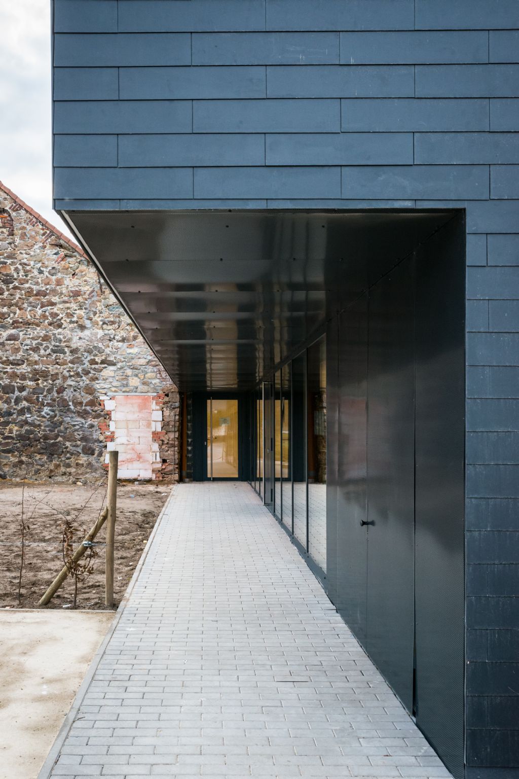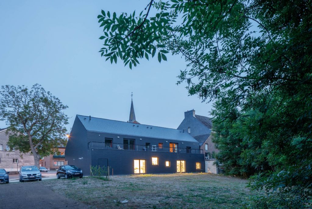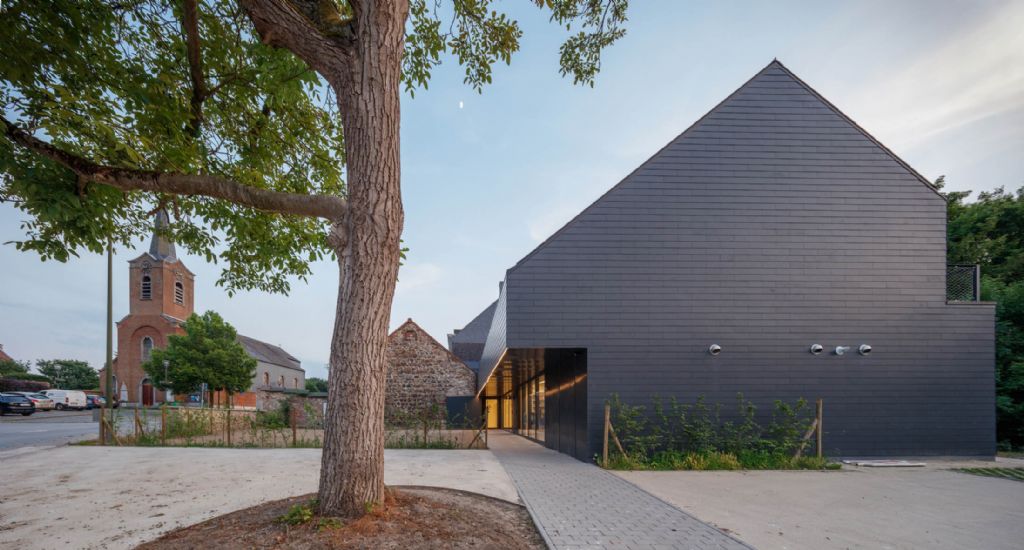Le bâtiment de la cure, le bâtiment accueillant le catéchisme et le mur d’enceinte à rue, caractéristique des constructions villageoises, inscrivent le projet dans une relation patrimoniale d’un point de vue respect des bâtiments existants mais également reconnaissance de ces qualités d’intégration urbanistique au cœur de village. Tant par l’implantation, le sens de faîtage que le respect de la hauteur de corniche du bâtiment existant auquel le projet vient se relier, le bâtiment proposé travaille sur base d’un respect de la prédominance de la cure et s’exprime comme étant une « extension » du bâtiment annexe. Le point de départ a ainsi été de rendre le gabarit de la nouvelle construction similaire à celui du bâtiment annexe, d’utiliser un revêtement de façade et pignon similaire à la toiture et aux pignons de la cure ainsi que de requalifier la zone de recul située entre le mur à rue et la nouvelle construction.