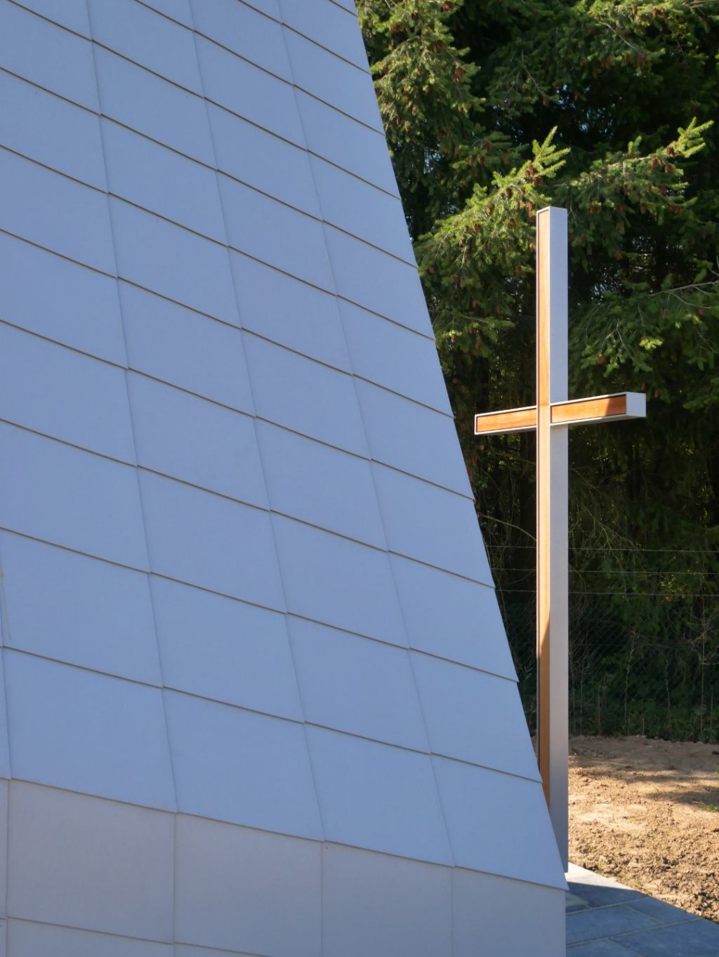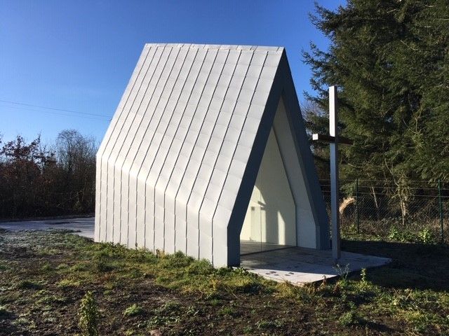 « L’enveloppe du bâtiment est recouverte d’ardoises en zinc Azengar – un zinc clair, mat et brut – spécialement réalisées pour la chapelle, sa texture, sa forme et sa luminosité changeante. »