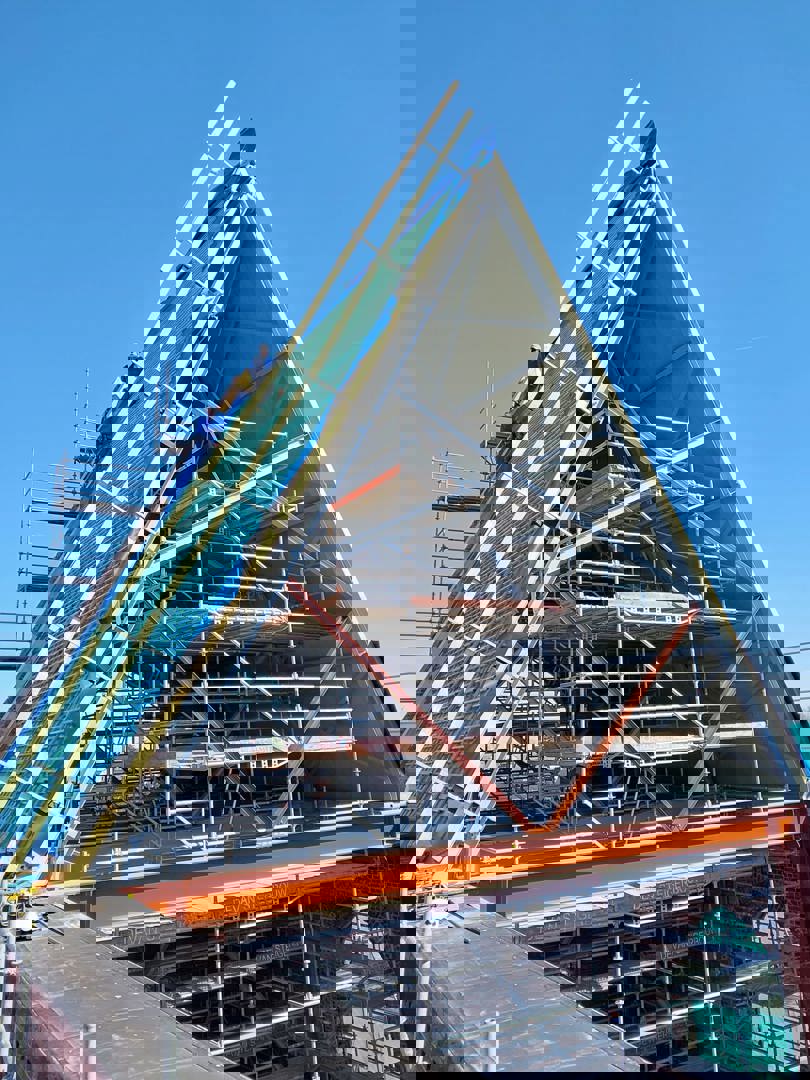 La toiture représentait un défi majeur dans ce projet de rénovation. Le faîte de la chapelle culmine à 26 mètres de hauteur et la pente du toit atteint 60°, ce qui est particulièrement raide. Dans ces conditions, une installation rapide était indispensable. L’équipe de construction a donc, après concertation, abandonné l’idée d’une toiture traditionnelle à fermes.