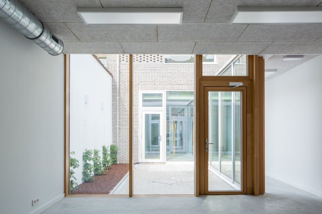 La création du patio permet de donner des façades aux fonctions implantées au rez-de-chaussée et de créer des vis-à-vis intéressants. Le bureau du rez-de-chaussée est séparé du couloir par une paroi vitrée. A l’étage, le second bureau est installé en façade arrière et surplombe le patio, avec vue sur le réfectoire. Les vestiaires sont installés à l’étage côté rue et reprennent les installations sanitaires.