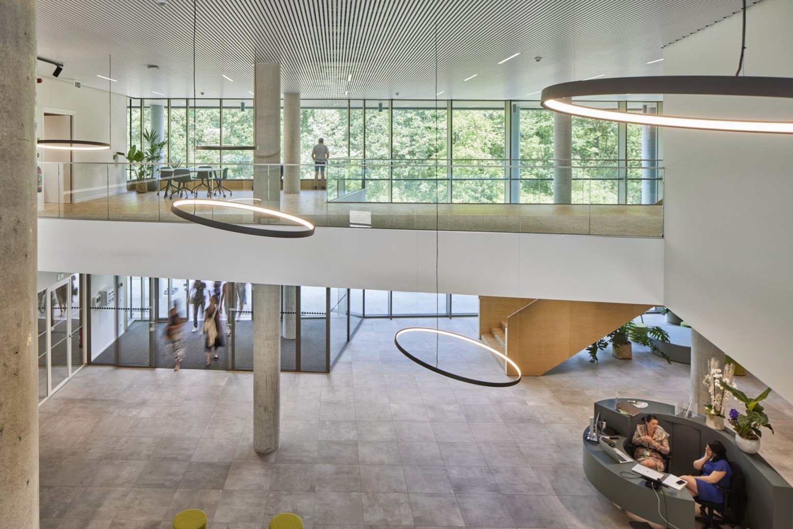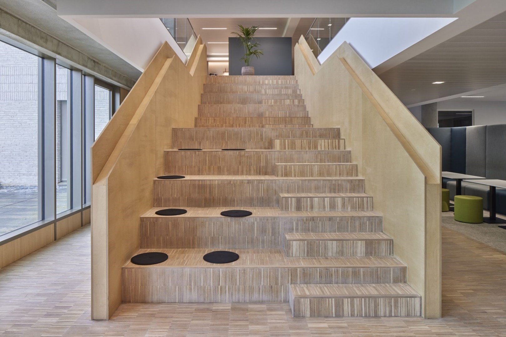 Le cadre paysager autour du bâtiment, conçu par OMGEVING, encourage les déplacements à pied et à vélo, et les architectes ont étendu cette idée à l'intérieur du bâtiment, en créant un parcours qui commence à l'entrée et qui, à la façon d'un arbre, se développe dans l'ensemble du bâtiment de bureaux, en passant notamment par des escaliers spacieux et par un plancher en bois chaleureux. Outre le mouvement, cette circulation favorise également les réunions formelles et informelles, pour lesquelles des espaces (de travail) spécifiques ont été prévus. La proximité du Demerpark a également été mise en avant le long de ce parcours, avec de grandes terrasses où il est possible de se détendre et de travailler en plein air.