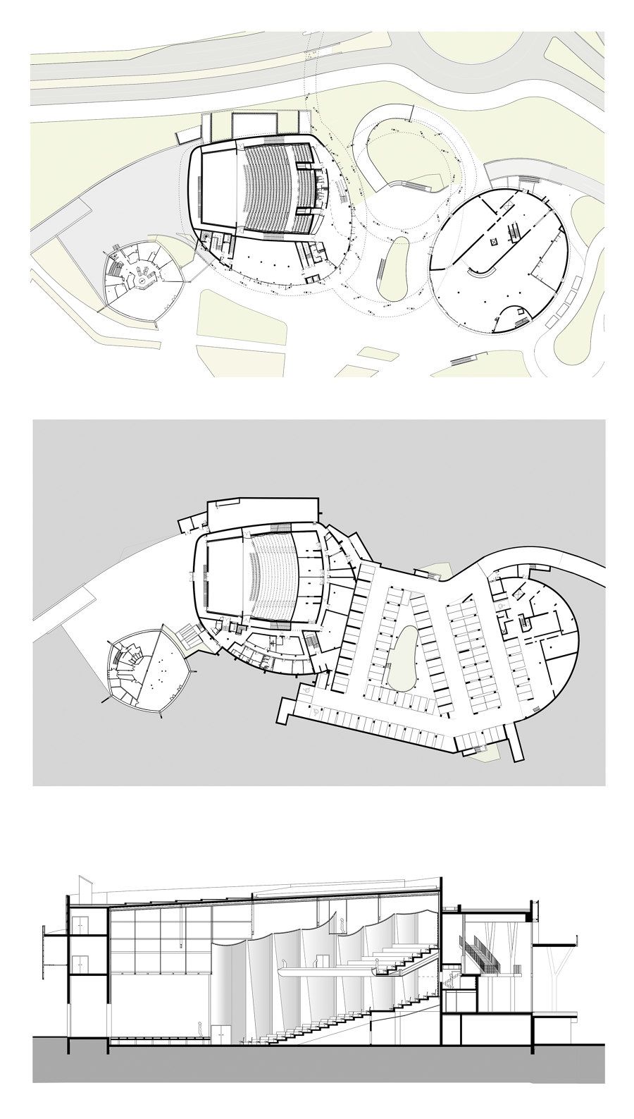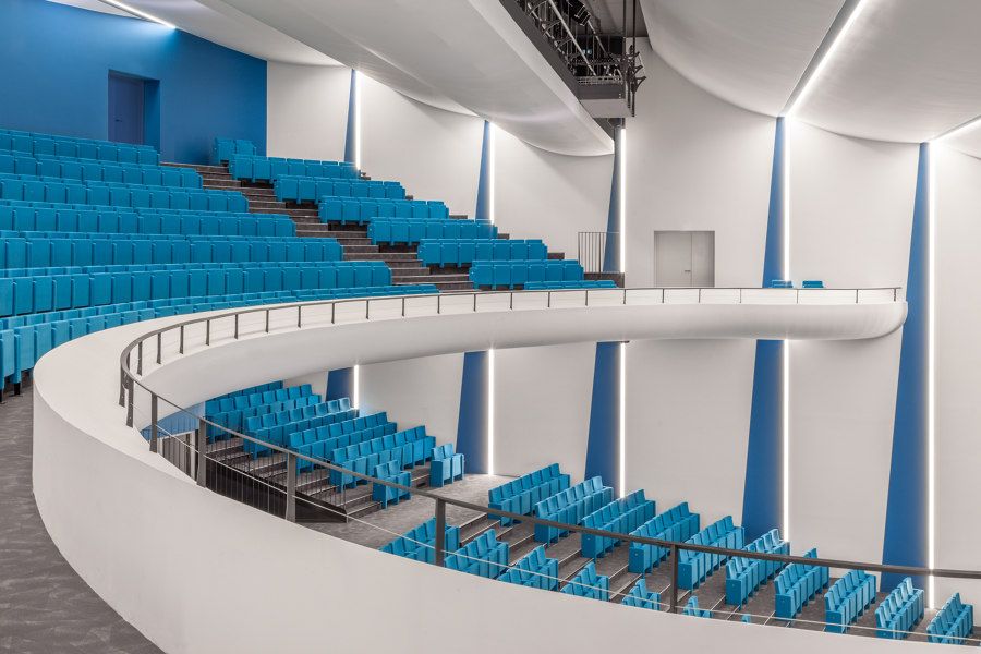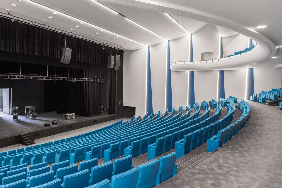 Le hall du palais se développe sur trois niveaux. Chacun se connecte à l'un des enroulements de la passerelle. Cette organisation spatiale très ludique permet d’accéder aisément de l’intérieur comme de l’extérieur, à pied comme en vélo, à tous les services de l’équipement : hall d’accueil, salle d’exposition, bureaux, salles de réunion et salle de spectacle de 1200 places dont le bleu turquoise, seule couleur de cet ensemble blanc, évoque l’onde méditerranéenne. Une vaste place doucement gradinée occupe la toiture de l’ensemble. Perchée au-dessus et sur un bord, une salle panoramique, dont la forme évoque un Solen (coquillage bivalve vulgairement appelé couteau de mer), offre une vue exceptionnelle sur le tout paysage Agathois.