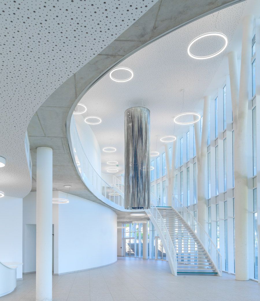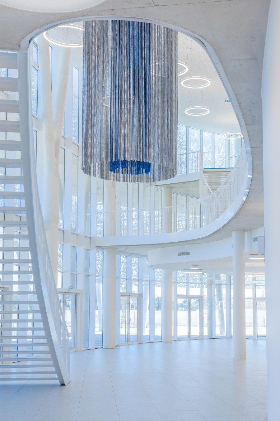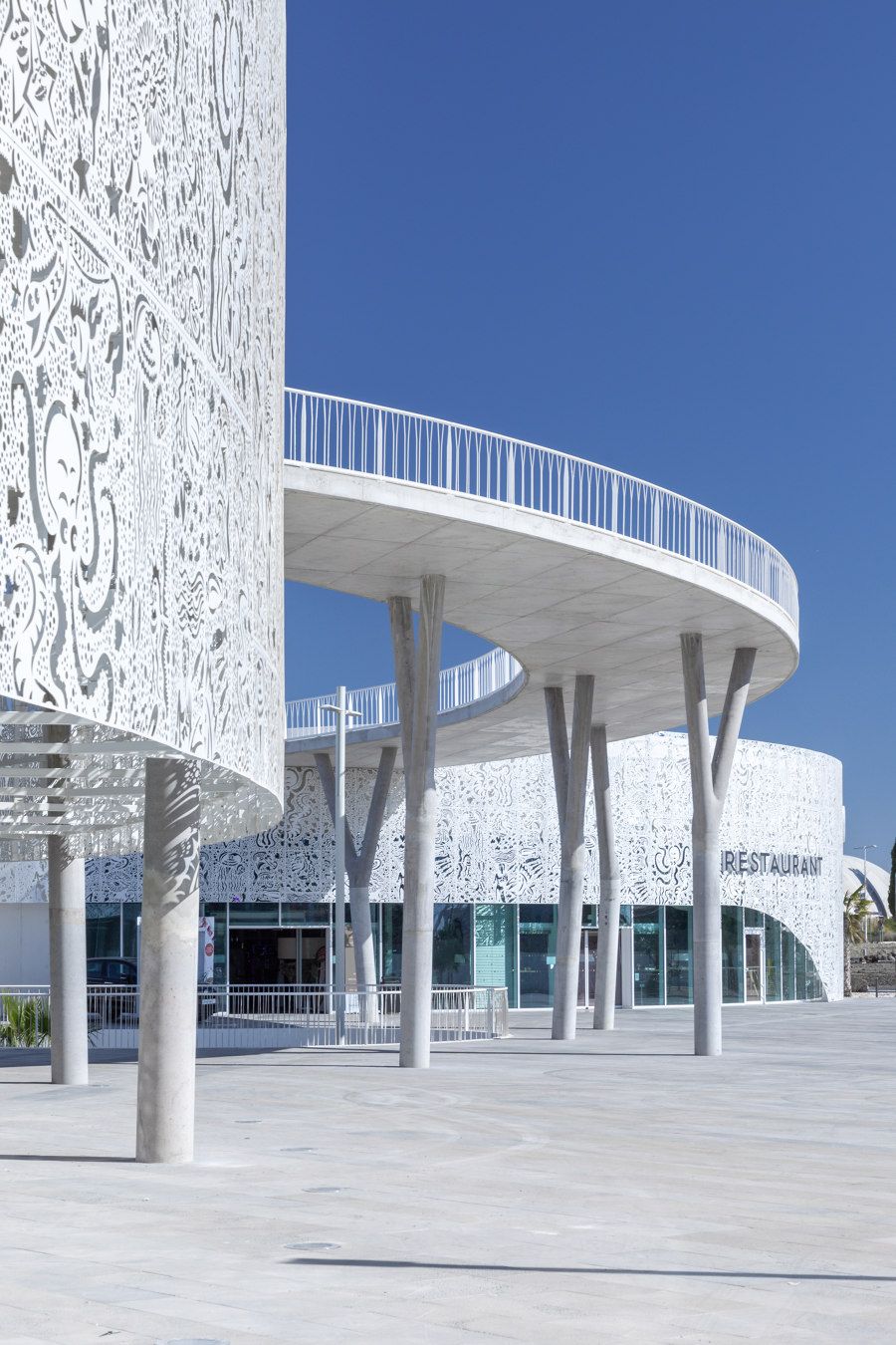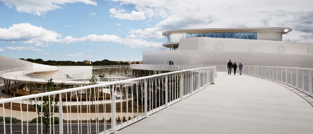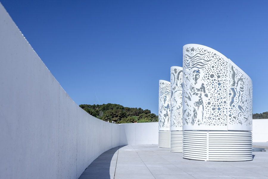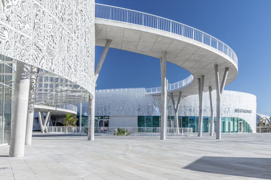 En étroite collaboration avec A+Architecture, Hervé di Rosa, artiste d’origine sétoise, a joué de manière malicieuse sur le thème des fonds marins pour concevoir la résille métallique blanche de 2900 m2 qui enveloppe les deux bâtiments de ce belvédère entre terre, mer et ciel.